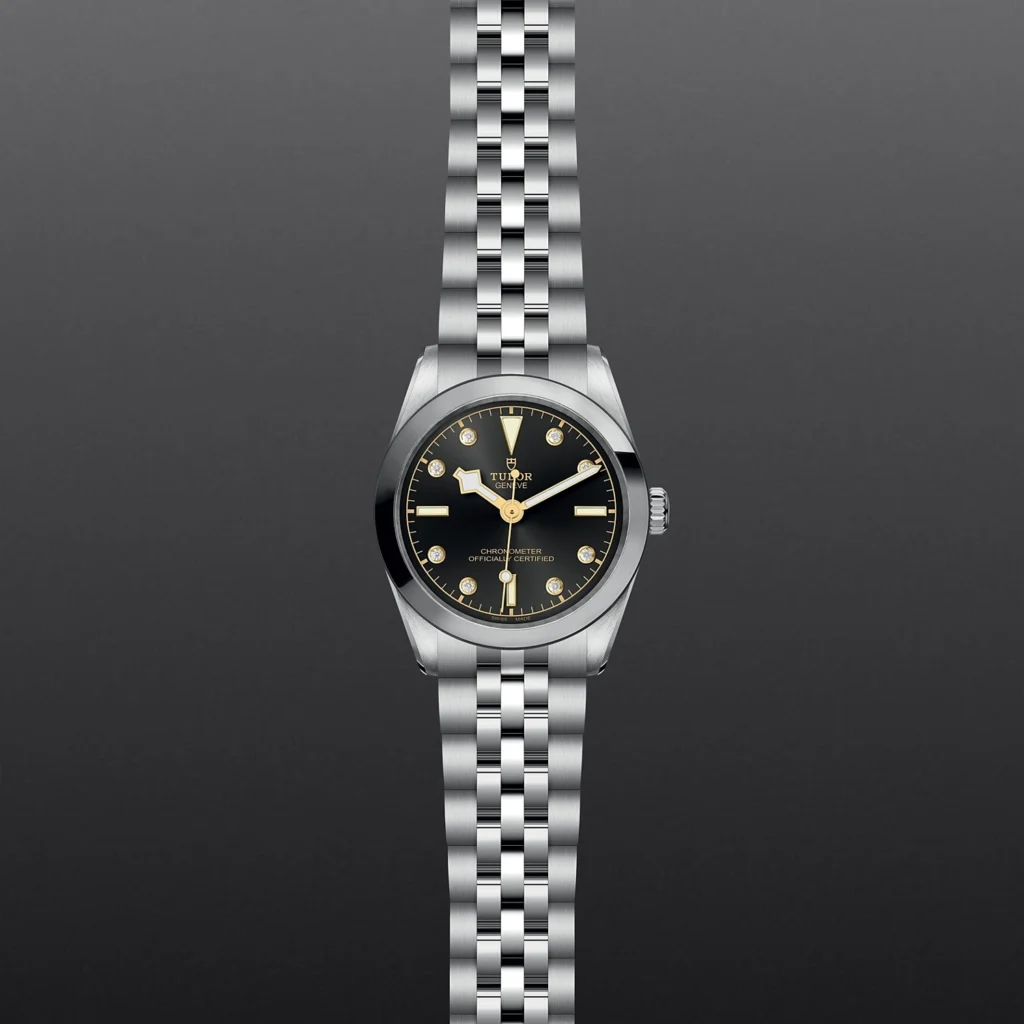 Caixa de 31 mm em aço, Bracelete em aço, Estojo Caixa de 31 mm em aço inoxidável com acabamento polido e acetinado, Bezel Luneta em aço inoxidável com acabamento polido e acetinado, Calibres de Manufatura MT5201 (COSC) Movimento mecânico de corda automática com sistema de rotor bidirecional, Mostrador Antracite com 8 diamantes, Coroa de rosca com a rosa TUDOR em relevo, Cristal Vidro de safira plano, Estanque até 100 m, Bracelete em aço inoxidável, acabamento polido e acetinado, com fecho desdobrável TUDOR “T-fit” e fecho de segurança, Tamanho Pequeno, Material Aço, Mostrador claro.
