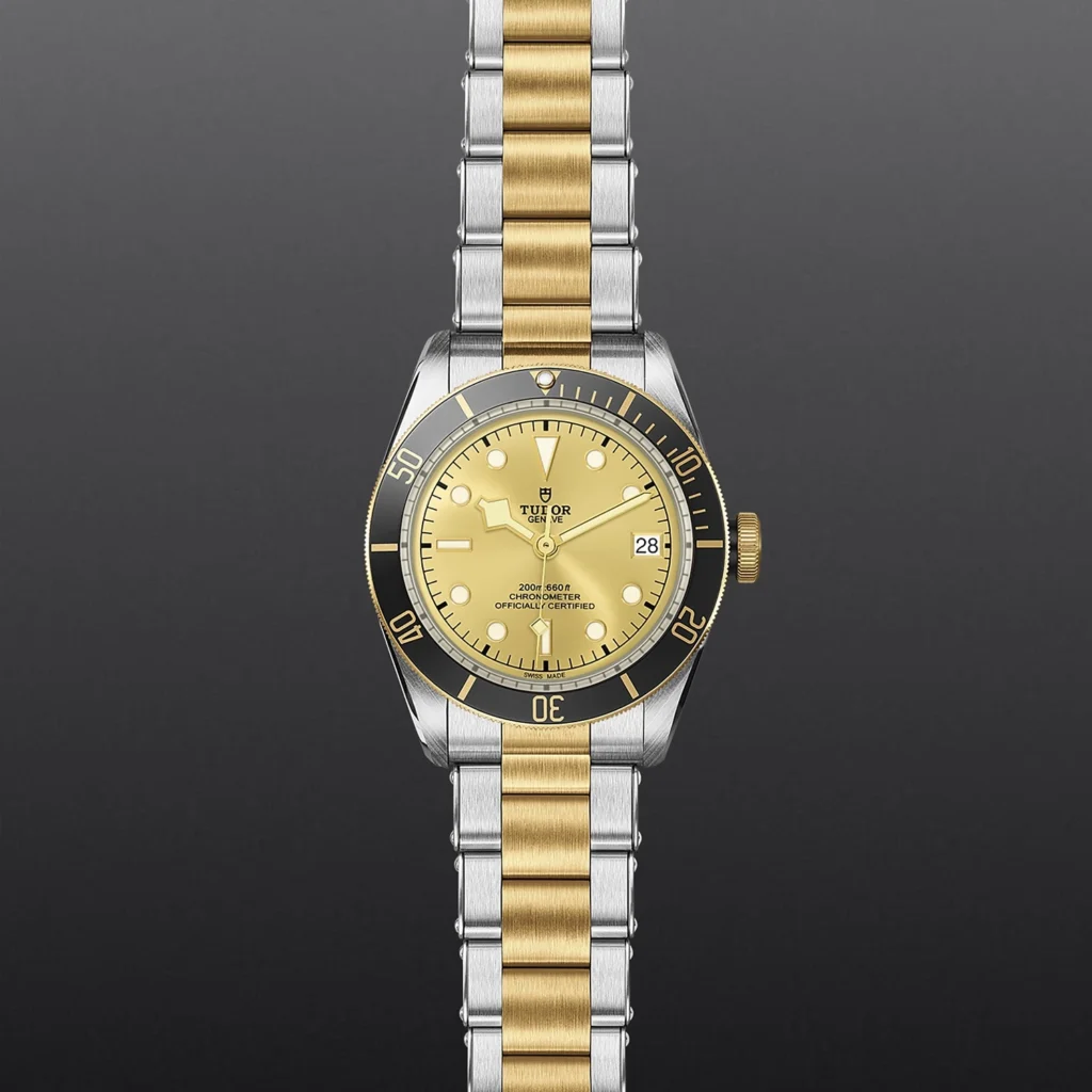 Caixa de 41 mm em aço, Bracelete em aço e ouro amarelo, Estojo Caixa de 41 mm em aço com acabamento polido e acetinado, Bezel Luneta giratória unidirecional em aço, revestida por uma camada de ouro amarelo de 0,3 mm, com disco de alumínio preto mate graduado de 60 minutos, marcas douradas, Calibre de Manufatura MT5612 (COSC) Movimento mecânico de corda automática com sistema de rotor bidirecional, Mostrador Cor champagne, côncavo, Coroa de rosca com a rosa TUDOR gravada e lacada em preto, com tubo da coroa em alumínio anodizado preto. Aço revestido por uma camada de ouro amarelo de 0,3 mm, Cristal Vidro de safira côncavo, Estanque até 200 m, Primeiros elos centrais, às 6 e 12 horas, em ouro amarelo maciço. Restantes elos centrais em aço ou aço revestido por uma camada de ouro amarelo de 0,2 mm. Fecho desdobrável e fecho de segurança, Tamanho Grande, Material Aço e ouro, Mostrador colorido.