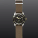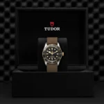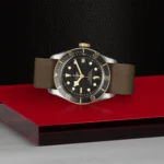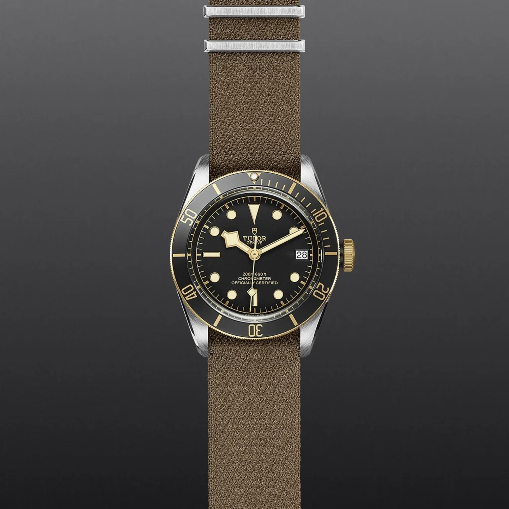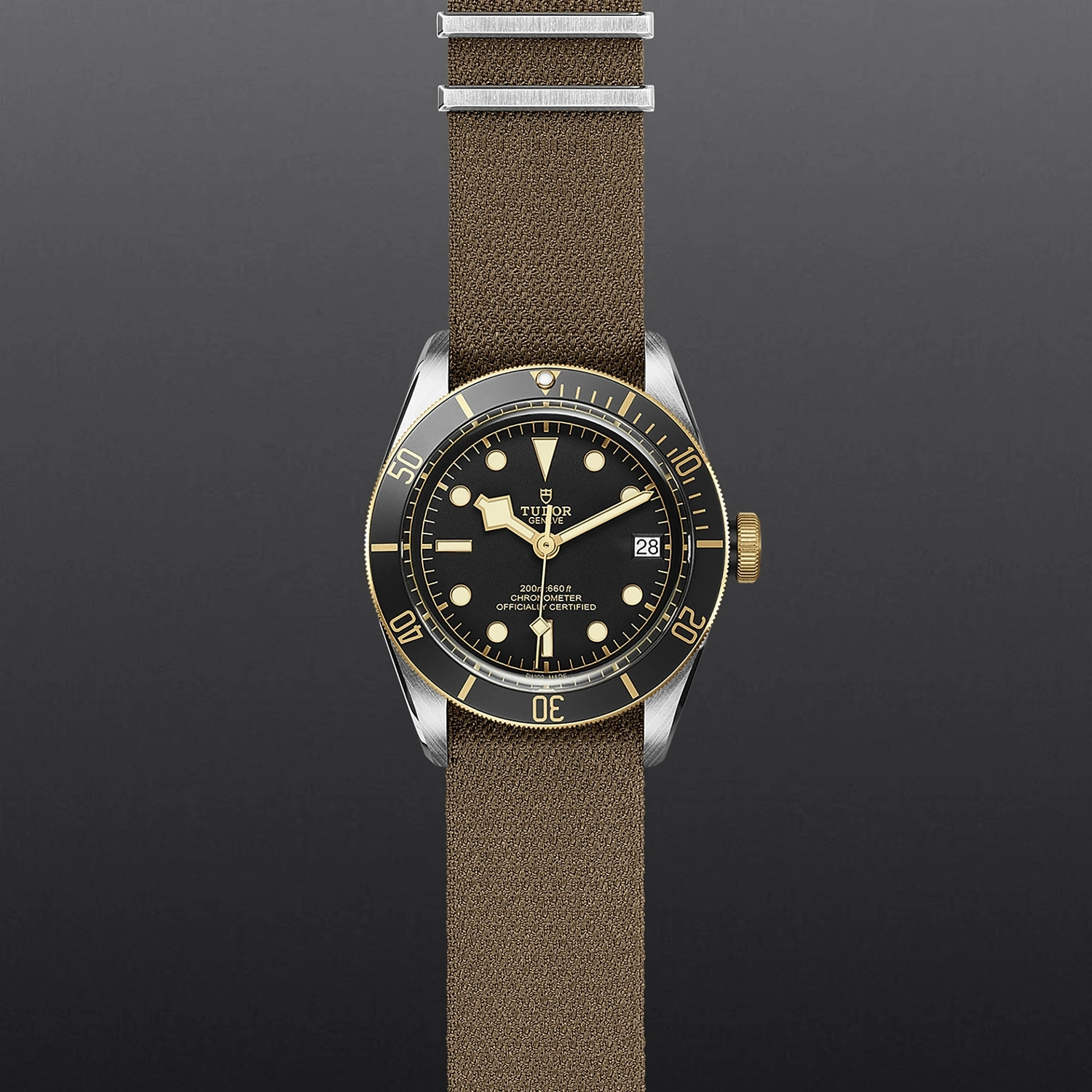 Caixa de 41 mm em aço, Bracelete em tecido, Estojo Caixa de 41 mm em aço com acabamento polido e acetinado, Bezel Luneta giratória unidirecional em aço, revestida por uma camada de ouro amarelo de 0,3 mm, com disco de alumínio preto mate graduado de 60 minutos, marcas douradas, Calibre de Manufatura MT5612 (COSC) Movimento mecânico de corda automática com sistema de rotor bidirecional, Mostrador Preto, côncavo, Coroa de rosca com a rosa TUDOR gravada e lacada em preto, com tubo da coroa em alumínio anodizado preto. Aço revestido por uma camada de ouro amarelo de 0,3 mm, Cristal Vidro de safira côncavo, Estanque até 200 m, Bracelete em tecido castanho com fivela, Tamanho Grande, Material Aço e ouro, Mostrador escuro.