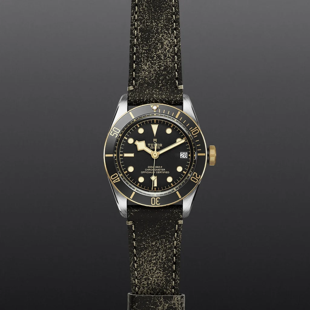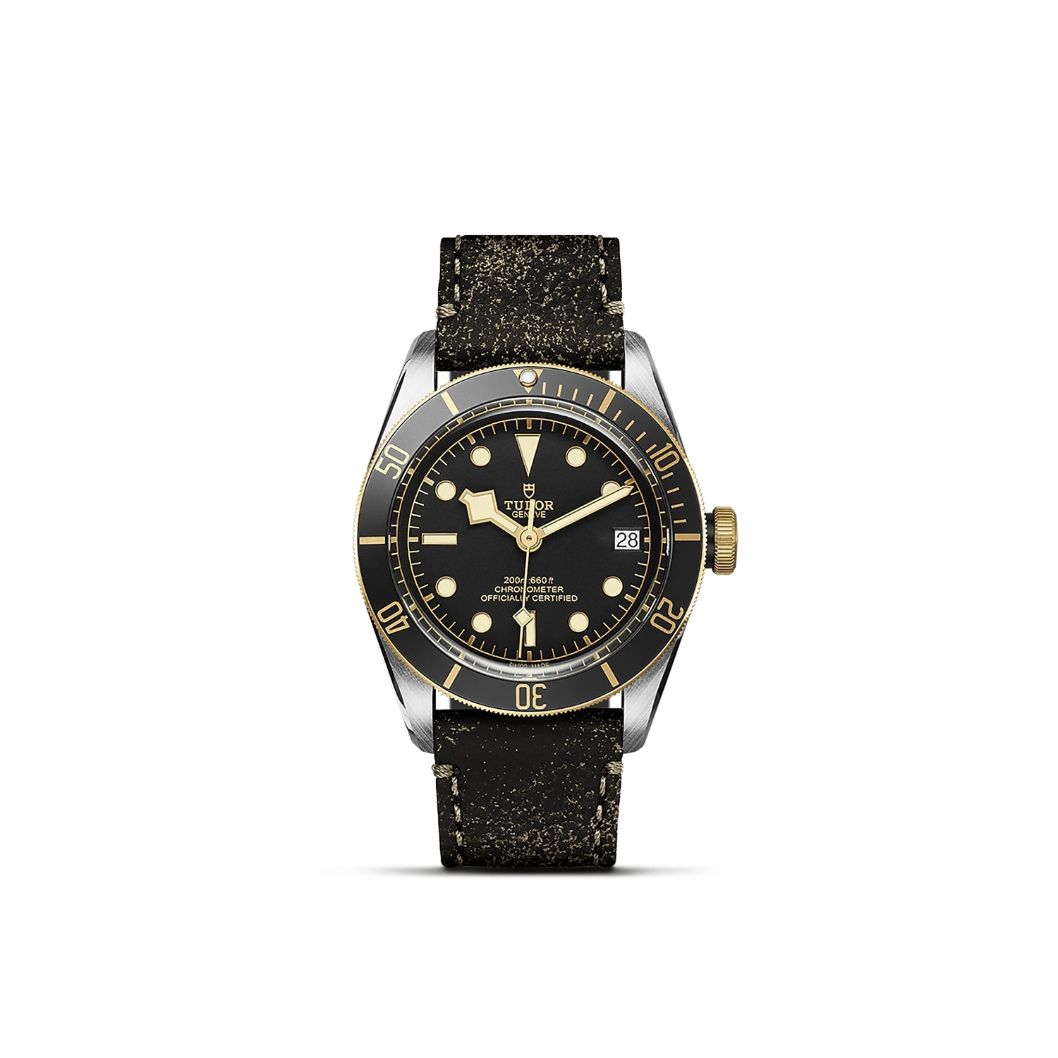 Caixa de 41 mm em aço, Bracelete em pele envelhecida, Estojo Caixa de 41 mm em aço com acabamento polido e acetinado, Bezel Luneta giratória unidirecional em aço, revestida por uma camada de ouro amarelo de 0,3 mm, com disco de alumínio preto mate graduado de 60 minutos, marcas douradas, Calibre de Manufatura MT5612 (COSC) Movimento mecânico de corda automática com sistema de rotor bidirecional, Mostrador Preto, côncavo, Coroa de rosca com a rosa TUDOR gravada e lacada em preto, com tubo da coroa em alumínio anodizado preto. Aço revestido por uma camada de ouro amarelo de 0,3 mm, Cristal Vidro de safira côncavo, Estanque até 200 m, Bracelete em pele castanha envelhecida com fecho desdobrável e fecho de segurança, Tamanho Grande, Material Aço e ouro, Mostrador escuro.