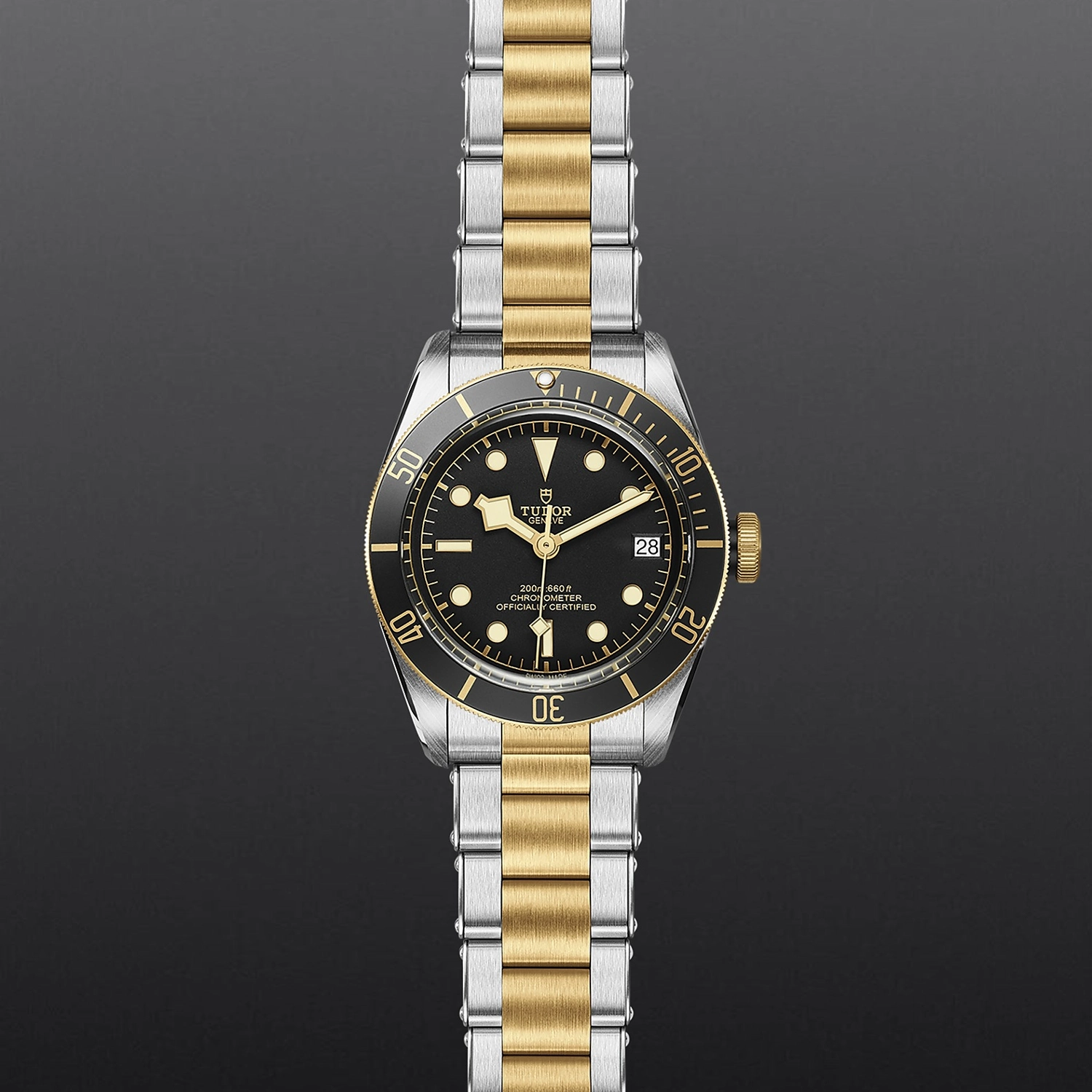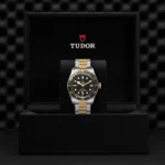 Caixa de 41 mm em aço, Bracelete em aço e ouro amarelo, Estojo Caixa de 41 mm em aço com acabamento polido e acetinado, Bezel Luneta giratória unidirecional em aço, revestida por uma camada de ouro amarelo de 0,3 mm, com disco de alumínio preto mate graduado de 60 minutos, marcas douradas, Calibre de Manufatura MT5612 (COSC) Movimento mecânico de corda automática com sistema de rotor bidirecional, Mostrador Preto, côncavo, Coroa de rosca com a rosa TUDOR gravada e lacada em preto, com tubo da coroa em alumínio anodizado preto. Aço revestido por uma camada de ouro amarelo de 0,3 mm, Cristal Vidro de safira côncavo, Estanque até 200 m, Primeiros elos centrais, às 6 e 12 horas, em ouro amarelo maciço. Restantes elos centrais em aço ou aço revestido por uma camada de ouro amarelo de 0,2 mm. Fecho desdobrável e fecho de segurança, Tamanho Grande, Material Aço e ouro, Mostrador escuro.