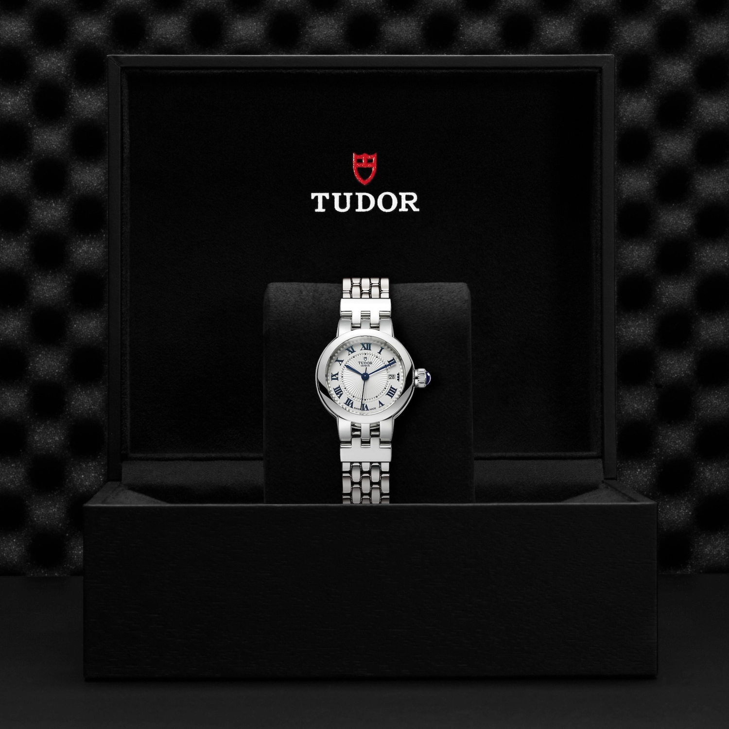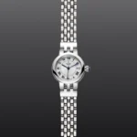 Caixa de 26 mm em aço, Bracelete em aço, Estojo Caixa de 26 mm em aço com acabamento polido, Bezel Luneta lisa em aço com acabamento polido, Movimento mecânico de corda automática, Calibre T201, Mostrador Opalino, Coroa de rosca em aço com espinela em cabochão azul transparente, Cristal Vidro de safira côncavo, Estanque até 100 m, Bracelete em aço com fecho desdobrável e fecho de segurança Elementos de fixação em aço, Tamanho Pequeno, Material Aço, Mostrador claro.