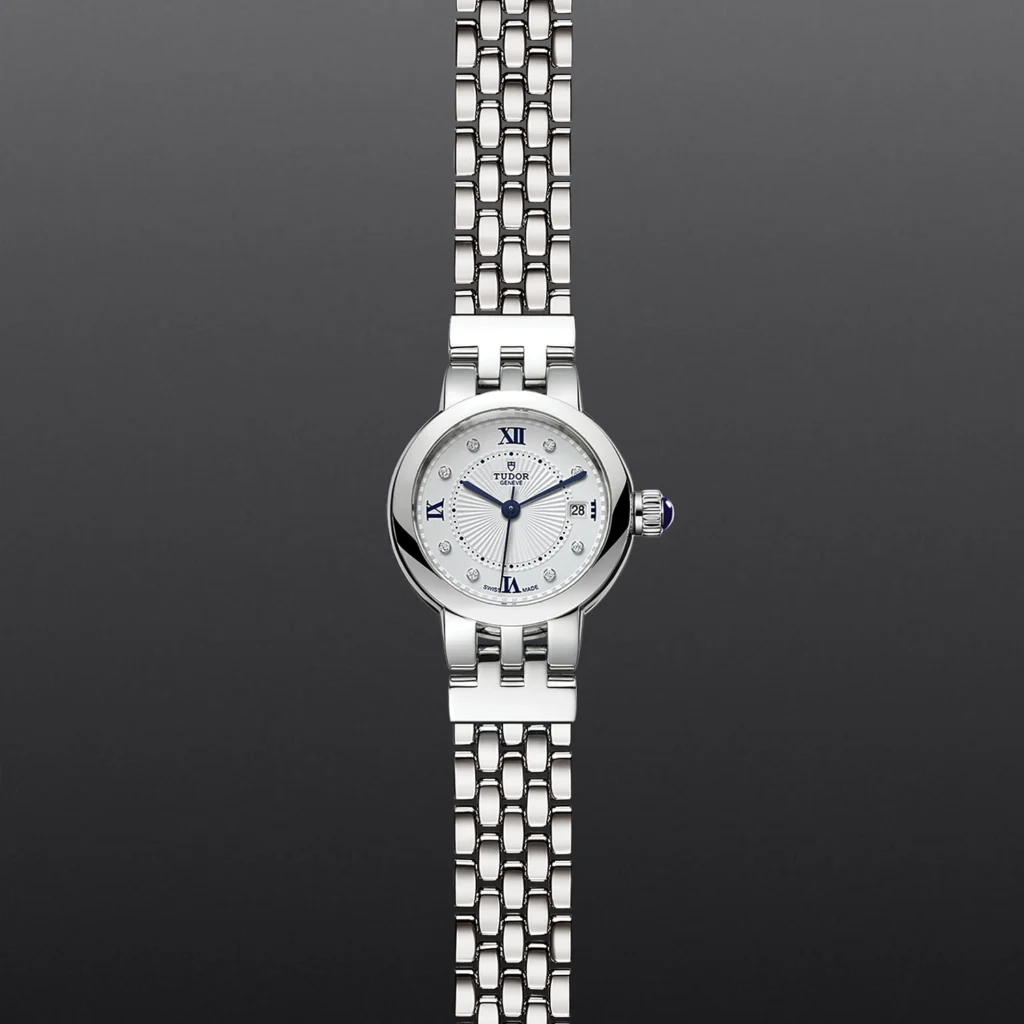 Clair de Rose M35200-0004, Caixa de 26 mm em aço, Bracelete em aço, Estojo Caixa de 26 mm em aço com acabamento polido, Bezel Luneta lisa em aço com acabamento polido, Movimento mecânico de corda automática, Calibre T201, Mostrador Opalino com 8 diamantes, Coroa de rosca em aço com espinela em cabochão azul transparente, Cristal Vidro de safira côncavo, Estanque até 100 m, Bracelete em aço com fecho desdobrável e fecho de segurança Elementos de fixação em aço, Tamanho Pequeno, Material Aço, Mostrador claro.
