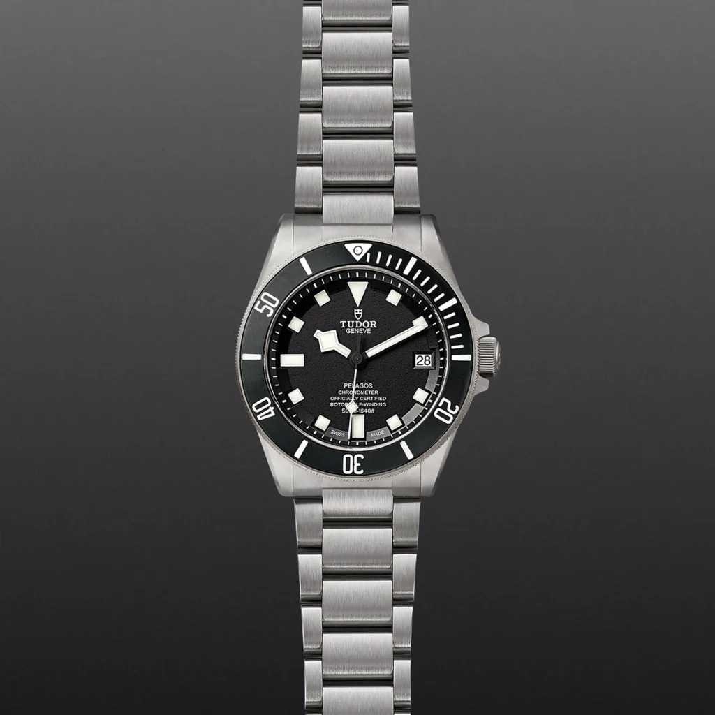 Pelagos M25600TN-0001, Disco em cerâmica preta mate, Bracelete em titânio, Estojo Caixa de 42 mm em titânio e aço com acabamento acetinado, Bezel Luneta giratória unidirecional em titânio, graduada de 60 minutos com disco em cerâmica preta mate e graduações com material luminescente branco, Calibre de Manufatura MT5612 (COSC) Movimento mecânico de corda automática com sistema de rotor bidirecional, Mostrador Preto com índices brancos, Coroa em titânio com o logótipo TUDOR em relevo Válvula de hélio às 9 horas, Cristal Vidro de safira, Estanque até 500 m, Bracelete em titânio com fecho desdobrável e fecho de segurança em aço com sistema de extensão da bracelete desenvolvido e patenteado pela TUDOR Bracelete adicional em borracha preta com fivela e extensão extra fornecida com o relógio, Tamanho Grande, Material Titânio, Mostrador escuro.