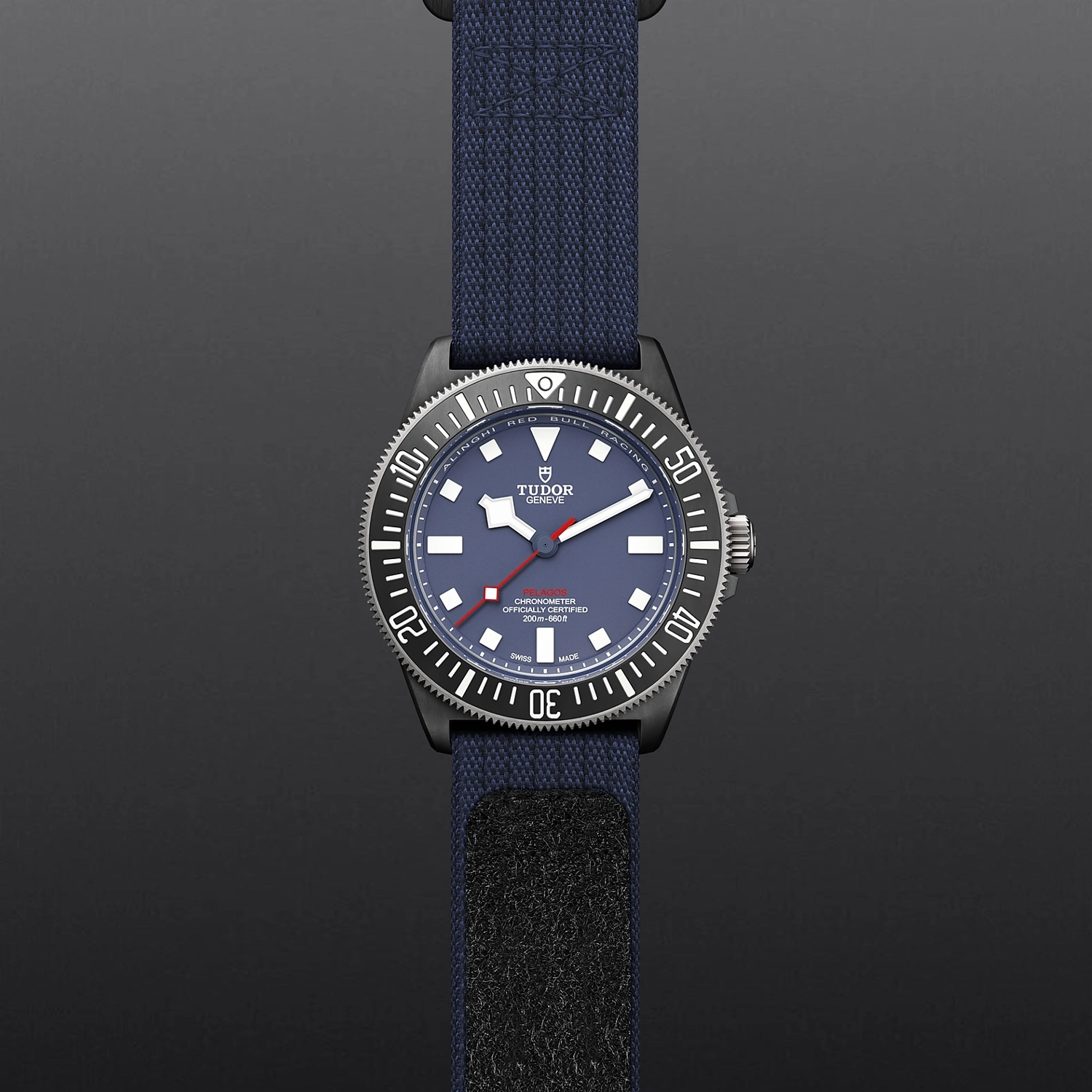 Pelagos FXD M25707KN-0001, Luneta em titânio com disco em compósito de carbono preto, Bracelete em tecido azul, Estojo Caixa de 42 mm em compósito de carbono preto com acabamento mate e o logótipo Alinghi Red Bull Racing gravado no fundo de caixa, Bezel Luneta bidirecional de 60 minutos em titânio com disco em compósito de carbono preto mate, 120 encaixes, Calibre de Manufatura MT5602 (COSC) Movimento mecânico de corda automática com sistema de rotor bidirecional, Mostrador Azul, mate, Coroa de rosca em titânio com o escudo TUDOR em relevo, Cristal Vidro de safira, Estanque até 200 m, Bracelete em tecido azul de peça única , Tamanho Grande, Material Compósito de carbono, Mostrador colorido.