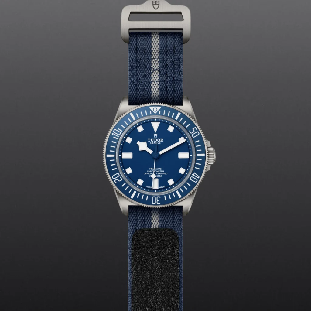 Pelagos FXD M25707B/25-0001, Luneta giratória unidirecional, Bracelete em titânio ou aço, Caixa de tamanho variável com acabamento acetinado, Bezel com disco em cerâmica e material luminescente, Calibre de Manufatura com certificação COSC ou METAS, Movimento mecânico de corda automática, mostrador com acabamento sunray ou mate, Cristal de safira, estanque até no mínimo 200 metros, Bracelete com fecho TUDOR T-fit, extensões e opções adicionais incluídas na caixa.
