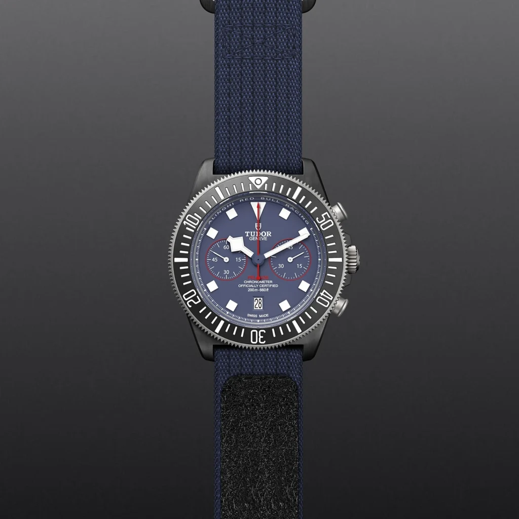 Pelagos FXD Chrono M25807KN-0001, Luneta em titânio com disco em compósito de carbono preto, Bracelete em tecido azul, Estojo Caixa de 43 mm em compósito de carbono preto com acabamento mate, Bezel Luneta bidirecional de 60 minutos em titânio com disco em compósito de carbono preto mate, 120 encaixes, Calibre de Manufatura MT5813 com função de cronógrafo Movimento de cronógrafo mecânico de corda automática com sistema de rotor bidirecional, Mostrador Azul, mate, apontamentos em vermelho nos contadores do cronógrafo, Coroa de rosca em titânio com o escudo TUDOR em relevo, Cristal Vidro de safira, Estanque até 200 m, Bracelete em tecido azul de peça única , Tamanho Grande, Material Compósito de carbono, Mostrador colorido.