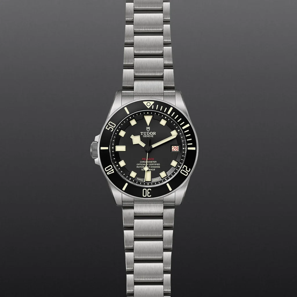Disco em cerâmica preta mate, Bracelete em titânio, Estojo Caixa de 42 mm em titânio e aço com acabamento acetinado Fundo de caixa em aço numerado, Bezel Luneta giratória unidirecional em titânio, graduada de 60 minutos com disco em cerâmica preta mate e graduações com revestimento luminescente bege, Calibre de Manufatura MT5612-LHD (COSC) Movimento mecânico de corda automática com sistema de rotor bidirecional, Mostrador Preto, Coroa de rosca em titânio às 9 horas com o logótipo TUDOR em relevo Válvula de hélio automática às 3 horas, Cristal Vidro de safira, Estanque até 500 m, Bracelete em titânio com fecho desdobrável e fecho de segurança em aço com sistema de extensão da bracelete desenvolvido e patenteado pela TUDOR Bracelete adicional em borracha preta com fivela e extensão extra fornecida com o relógio, Tamanho Grande, Material Titânio, Mostrador escuro.