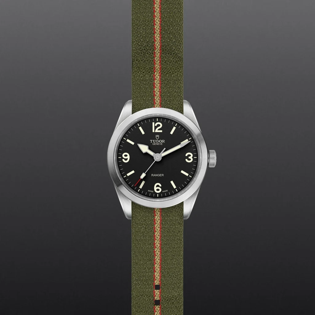 Movimento mecânico de corda automática com sistema de rotor bidirecional, Mostrador Preto, côncavo, Coroa de rosca em aço com a rosa TUDOR em relevo, Cristal Vidro de safira côncavo, Estanque até 100 m, Bracelete em tecido verde com faixas vermelhas e beges com fivela 0, Tamanho Médio, Material Aço, Mostrador escuro.