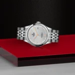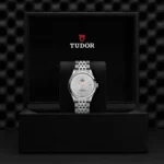 TUDOR 1926 M91450-0001, Luneta giratória unidirecional, Bracelete em titânio ou aço, Caixa de tamanho variável com acabamento acetinado, Bezel com disco em cerâmica e material luminescente, Calibre de Manufatura com certificação COSC ou METAS, Movimento mecânico de corda automática, mostrador com acabamento sunray ou mate, Cristal de safira, estanque até no mínimo 200 metros, Bracelete com fecho TUDOR T-fit, extensões e opções adicionais incluídas na caixa.