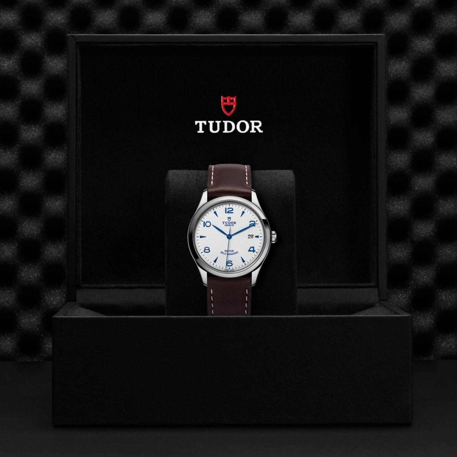 TUDOR 1926 M91550-0010, Luneta giratória unidirecional, Bracelete em titânio ou aço, Caixa de tamanho variável com acabamento acetinado, Bezel com disco em cerâmica e material luminescente, Calibre de Manufatura com certificação COSC ou METAS, Movimento mecânico de corda automática, mostrador com acabamento sunray ou mate, Cristal de safira, estanque até no mínimo 200 metros, Bracelete com fecho TUDOR T-fit, extensões e opções adicionais incluídas na caixa.