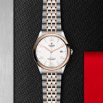 TUDOR 1926 M91551-0009, Luneta giratória unidirecional, Bracelete em titânio ou aço, Caixa de tamanho variável com acabamento acetinado, Bezel com disco em cerâmica e material luminescente, Calibre de Manufatura com certificação COSC ou METAS, Movimento mecânico de corda automática, mostrador com acabamento sunray ou mate, Cristal de safira, estanque até no mínimo 200 metros, Bracelete com fecho TUDOR T-fit, extensões e opções adicionais incluídas na caixa.