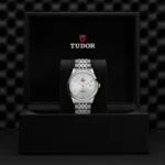 TUDOR 1926 M91650-0001, Luneta giratória unidirecional, Bracelete em titânio ou aço, Caixa de tamanho variável com acabamento acetinado, Bezel com disco em cerâmica e material luminescente, Calibre de Manufatura com certificação COSC ou METAS, Movimento mecânico de corda automática, mostrador com acabamento sunray ou mate, Cristal de safira, estanque até no mínimo 200 metros, Bracelete com fecho TUDOR T-fit, extensões e opções adicionais incluídas na caixa.