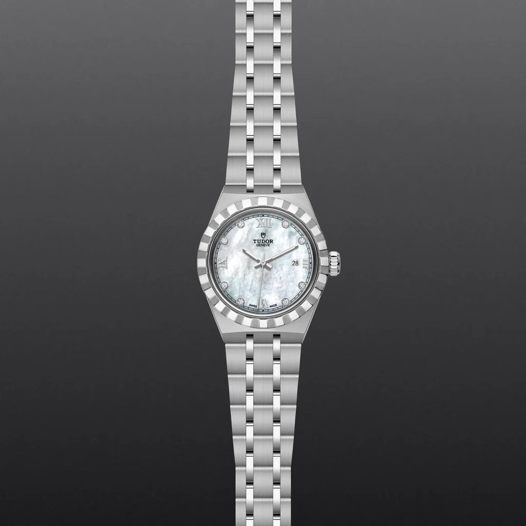 TUDOR Royal M28300-0005, Caixa de 28 mm em aço, Mostrador cravejado com diamantes, Estojo Caixa de 28 mm em aço 316L com acabamento polido e acetinado, Bezel Luneta com ranhuras em aço 316L, alternando estrias gravadas com acabamento polido, Movimento mecânico de corda automática, Calibre T201, Mostrador Madrepérola branca cravejada com pedras preciosas, Coroa de rosca em aço 316L adornada com o logótipo TUDOR em relevo, Cristal Vidro de safira, Estanque até 100 m, Bracelete incorporada em aço 316L, 5 filas, elos centrais e externos acetinados e escovados, elos intercalados polidos, com fecho desdobrável e fecho de segurança, Tamanho Pequeno, Material Aço, Mostrador colorido.