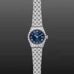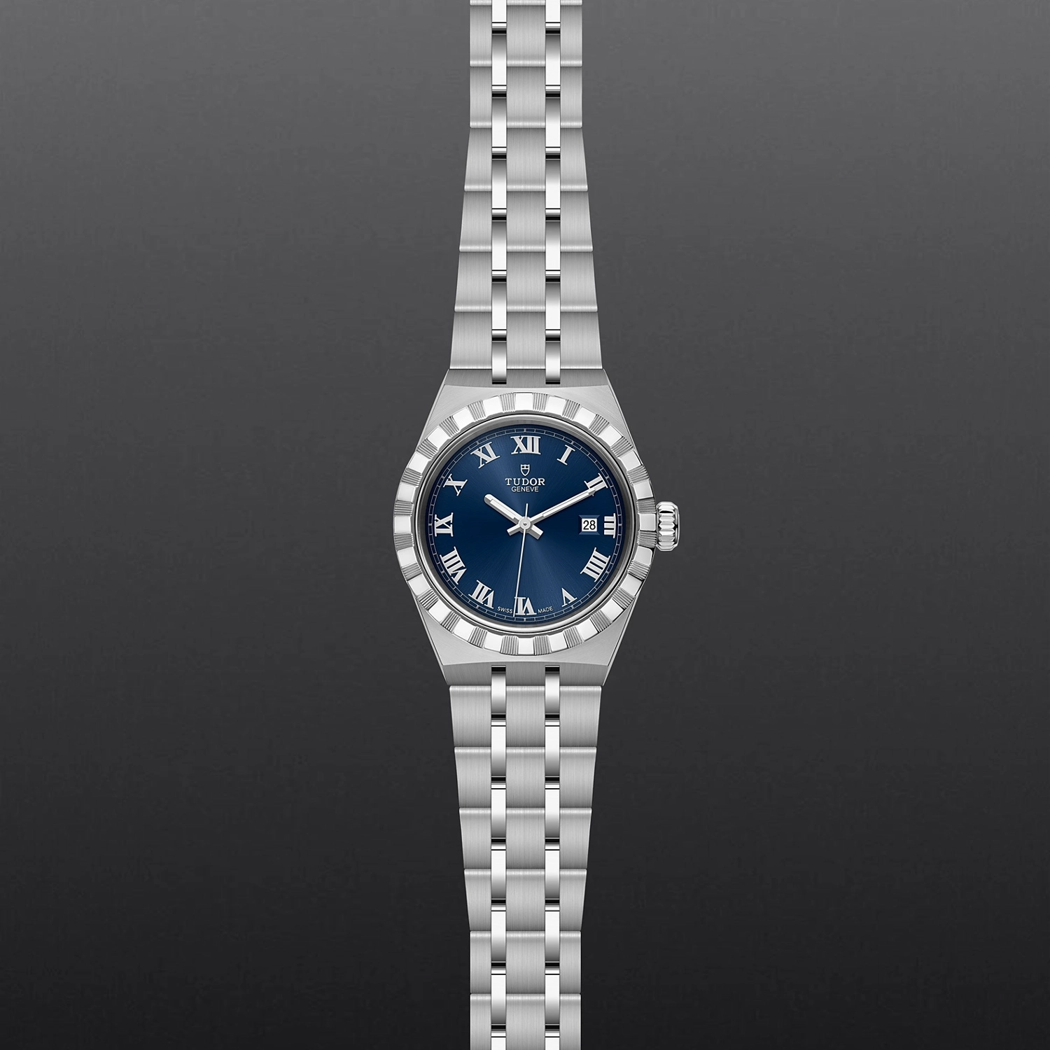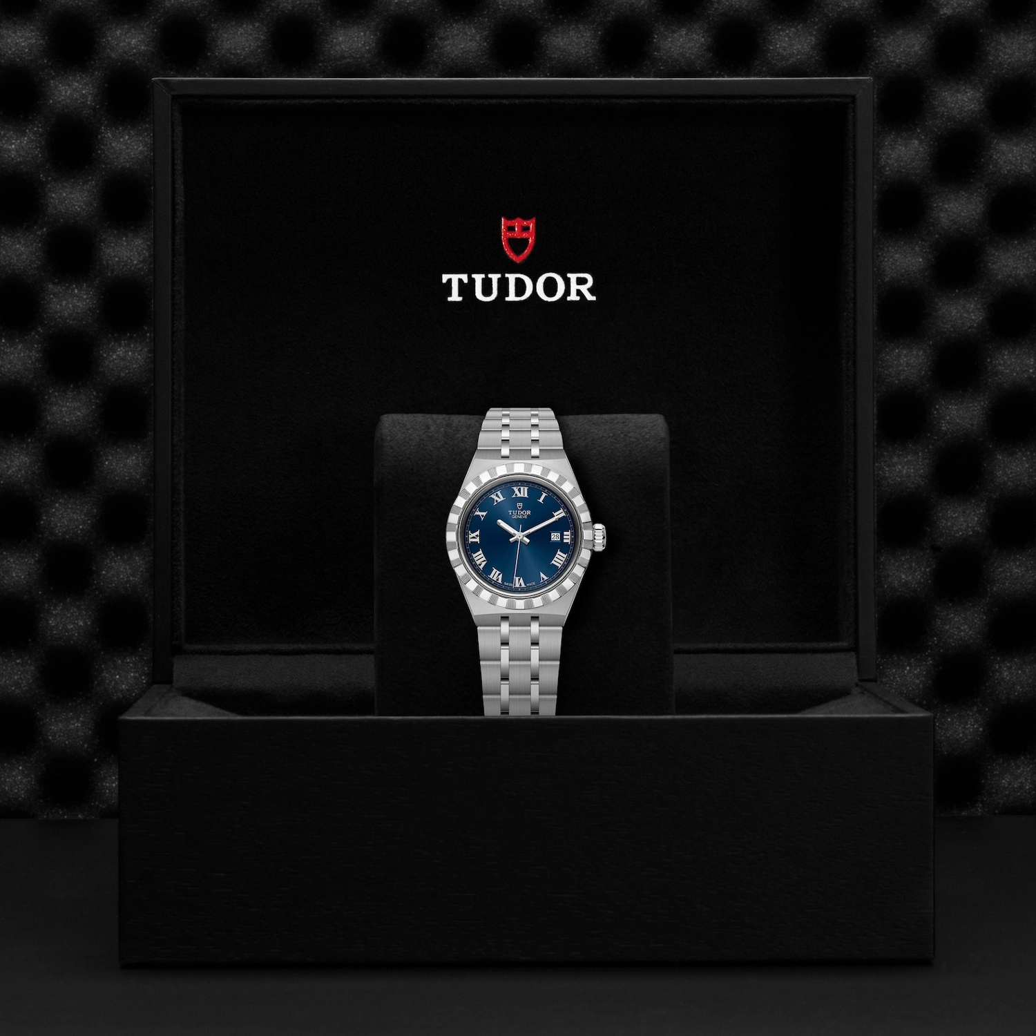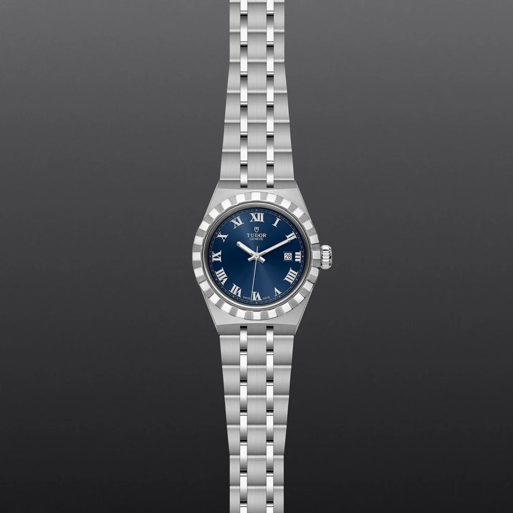 TUDOR Royal M28300-0006, Caixa de 28 mm em aço, Mostrador azul, Estojo Caixa de 28 mm em aço 316L com acabamento polido e acetinado, Bezel Luneta com ranhuras em aço 316L, alternando estrias gravadas com acabamento polido, Movimento mecânico de corda automática, Calibre T201, Mostrador Azul, acabamento sunray, Coroa de rosca em aço 316L adornada com o logótipo TUDOR em relevo, Cristal Vidro de safira, Estanque até 100 m, Bracelete incorporada em aço 316L, 5 filas, elos centrais e externos acetinados e escovados, elos intercalados polidos, com fecho desdobrável e fecho de segurança, Tamanho Pequeno, Material Aço, Mostrador colorido.