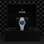 Caixa de 28 mm em aço, Mostrador azul, Estojo Caixa de 28 mm em aço 316L com acabamento polido e acetinado, Bezel Luneta com ranhuras em aço 316L, alternando estrias gravadas com acabamento polido, Movimento mecânico de corda automática, Calibre T201, Mostrador Azul, acabamento sunray, Coroa de rosca em aço 316L adornada com o logótipo TUDOR em relevo, Cristal Vidro de safira, Estanque até 100 m, Bracelete incorporada em aço 316L, 5 filas, elos centrais e externos acetinados e escovados, elos intercalados polidos, com fecho desdobrável e fecho de segurança, Tamanho Pequeno, Material Aço, Mostrador colorido.