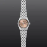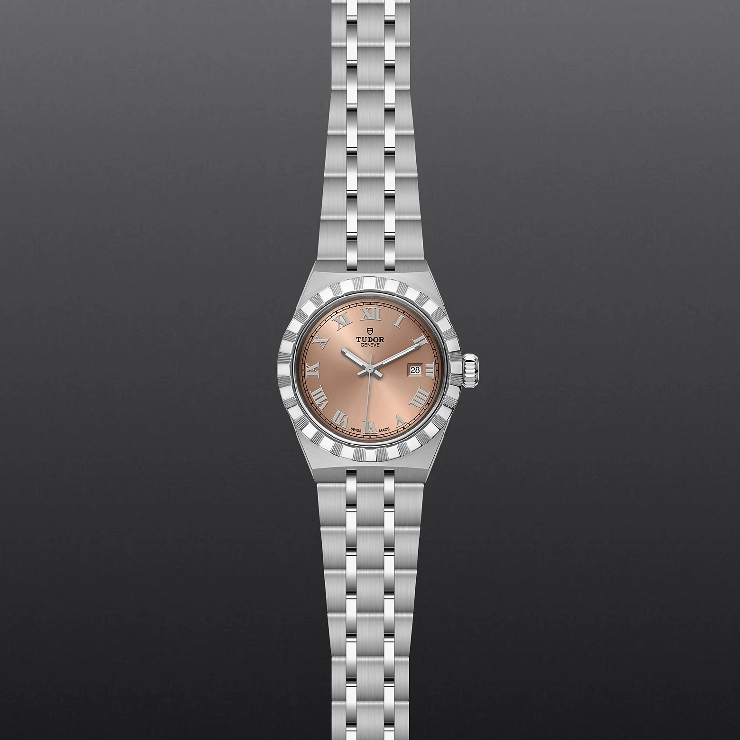 TUDOR Royal M28300-0008, Caixa de 28 mm em aço, Mostrador rosa salmão, Estojo Caixa de 28 mm em aço 316L com acabamento polido e acetinado, Bezel Luneta com ranhuras em aço 316L, alternando estrias gravadas com acabamento polido, Movimento mecânico de corda automática, Calibre T201, Mostrador Rosa salmão, Coroa de rosca em aço 316L adornada com o logótipo TUDOR em relevo, Cristal Vidro de safira, Estanque até 100 m, Bracelete incorporada em aço 316L, 5 filas, elos centrais e externos acetinados e escovados, elos intercalados polidos, com fecho desdobrável e fecho de segurança, Tamanho Pequeno, Material Aço, Mostrador colorido.