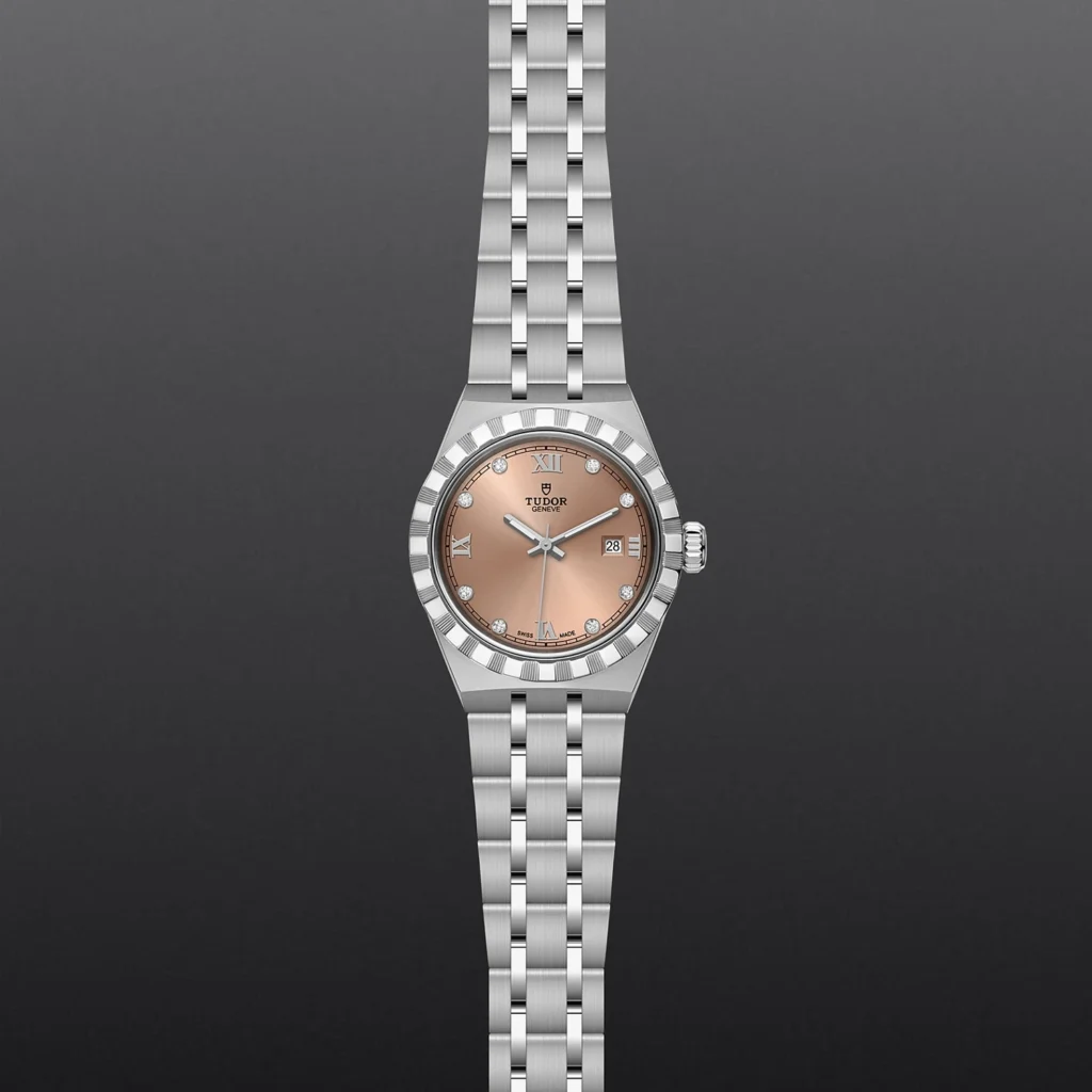 TUDOR Royal M28300-0010, Caixa de 28 mm em aço, Mostrador cravejado com diamantes, Estojo Caixa de 28 mm em aço 316L com acabamento polido e acetinado, Bezel Luneta com ranhuras em aço 316L, alternando estrias gravadas com acabamento polido, Movimento mecânico de corda automática, Calibre T201, Mostrador Rosa salmão com 8 diamantes, Coroa de rosca em aço 316L adornada com o logótipo TUDOR em relevo, Cristal Vidro de safira, Estanque até 100 m, Bracelete incorporada em aço 316L, 5 filas, elos centrais e externos acetinados e escovados, elos intercalados polidos, com fecho desdobrável e fecho de segurança, Tamanho Pequeno, Material Aço, Mostrador colorido.