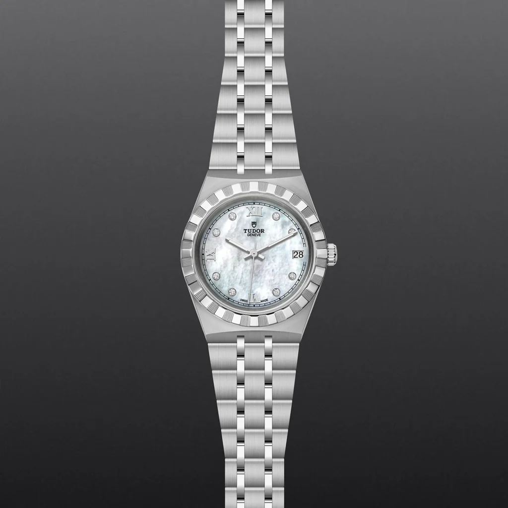 TUDOR Royal M28400-0005, Caixa de 34 mm em aço, Mostrador cravejado com diamantes, Estojo Caixa de 34 mm em aço com acabamento polido e acetinado, Bezel Luneta com ranhuras em aço 316L, alternando estrias gravadas com acabamento polido, Movimento mecânico de corda automática, Calibre T601, Mostrador Madrepérola branca cravejada com pedras preciosas, Coroa de rosca em aço com o logótipo TUDOR, Cristal Vidro de safira, Estanque até 100 m, Bracelete incorporada em aço 316L, 5 filas, elos centrais e externos acetinados e escovados, elos intercalados polidos, com fecho desdobrável e fecho de segurança, Tamanho Pequeno, Material Aço, Mostrador colorido.