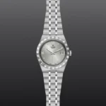 TUDOR Royal M28500-0002, Caixa de 38 mm em aço, Mostrador cravejado com diamantes, Estojo Caixa de 38 mm em aço com acabamento polido e acetinado, Bezel Luneta com ranhuras em aço 316L, alternando estrias gravadas com acabamento polido, Movimento mecânico de corda automática, Calibre T601, Mostrador Prateado, acabamento sunray, com diamantes, Coroa de rosca em aço com o logótipo TUDOR, Cristal Vidro de safira, Estanque até 100 m, Bracelete incorporada em aço 316L, 5 filas, elos centrais e externos acetinados e escovados, elos intercalados polidos, com fecho desdobrável e fecho de segurança, Tamanho Médio, Material Aço, Mostrador claro.