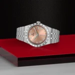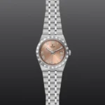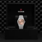 TUDOR Royal M28500-0007, Caixa de 38 mm em aço, Mostrador rosa salmão, Estojo Caixa de 38 mm em aço com acabamento polido e acetinado, Bezel Luneta com ranhuras em aço 316L, alternando estrias gravadas com acabamento polido, Movimento mecânico de corda automática, Calibre T601, Mostrador Rosa salmão, Coroa de rosca em aço com o logótipo TUDOR, Cristal Vidro de safira, Estanque até 100 m, Bracelete incorporada em aço 316L, 5 filas, elos centrais e externos acetinados e escovados, elos intercalados polidos, com fecho desdobrável e fecho de segurança, Tamanho Médio, Material Aço, Mostrador colorido.