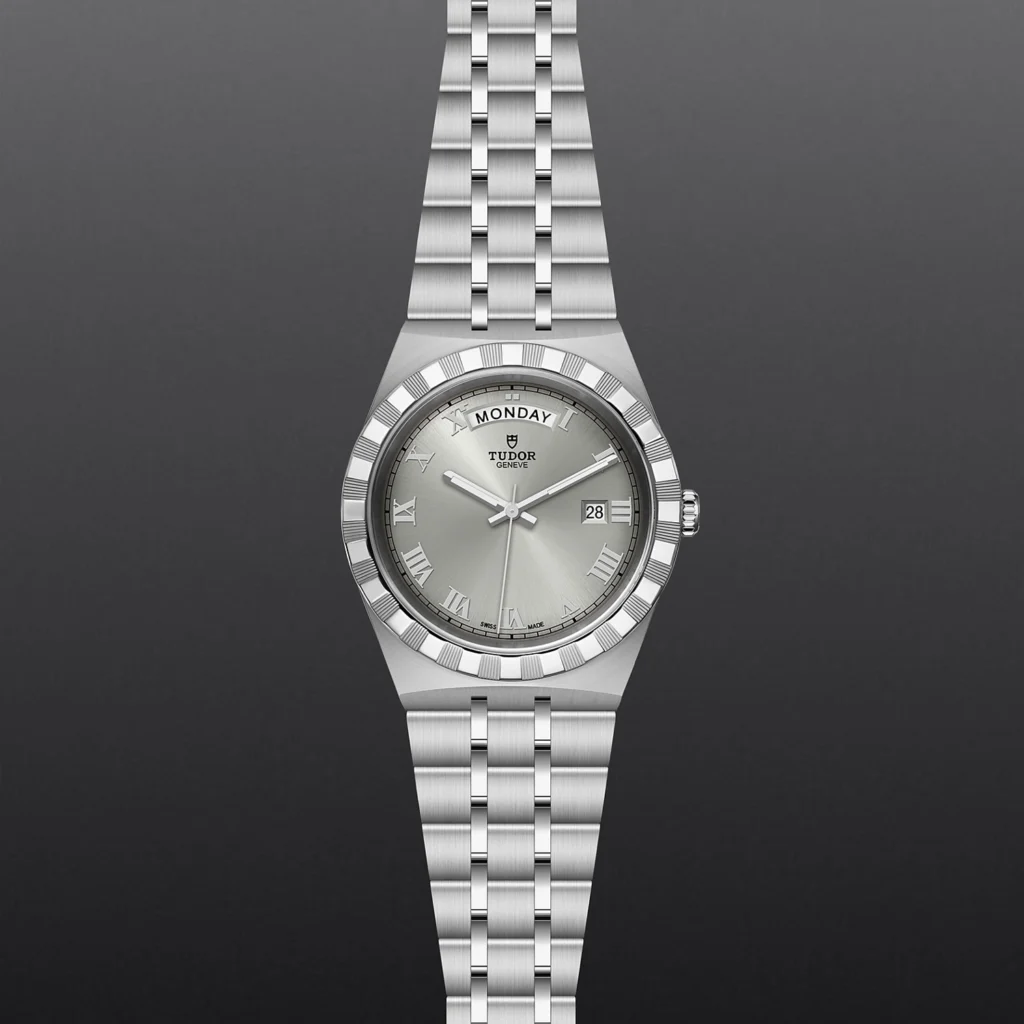 TUDOR Royal M28600-0001, Caixa de 41 mm em aço, Mostrador prateado, Estojo Caixa de 41 mm em aço com acabamento polido e acetinado, Bezel Luneta com ranhuras em aço 316L, alternando estrias gravadas com acabamento polido, Movimento mecânico de corda automática, Calibre T603, Mostrador Prateado, acabamento sunray, Coroa de rosca em aço com o logótipo TUDOR, Cristal Vidro de safira, Estanque até 100 m, Bracelete incorporada em aço 316L, 5 filas, elos centrais e externos acetinados e escovados, elos intercalados polidos, com fecho desdobrável e fecho de segurança, Tamanho Grande, Material Aço, Mostrador claro.