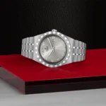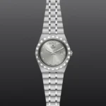 TUDOR Royal M28600-0002, Caixa de 41 mm em aço, Mostrador cravejado com diamantes, Estojo Caixa de 41 mm em aço com acabamento polido e acetinado, Bezel Luneta com ranhuras em aço 316L, alternando estrias gravadas com acabamento polido, Movimento mecânico de corda automática, Calibre T603, Mostrador Prateado, acabamento sunray, com diamantes, Coroa de rosca em aço com o logótipo TUDOR, Cristal Vidro de safira, Estanque até 100 m, Bracelete incorporada em aço 316L, 5 filas, elos centrais e externos acetinados e escovados, elos intercalados polidos, com fecho desdobrável e fecho de segurança, Tamanho Grande, Material Aço, Mostrador claro.