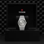 Caixa de 41 mm em aço, Mostrador cravejado com diamantes, Estojo Caixa de 41 mm em aço com acabamento polido e acetinado, Bezel Luneta com ranhuras em aço 316L, alternando estrias gravadas com acabamento polido, Movimento mecânico de corda automática, Calibre T603, Mostrador Prateado, acabamento sunray, com diamantes, Coroa de rosca em aço com o logótipo TUDOR, Cristal Vidro de safira, Estanque até 100 m, Bracelete incorporada em aço 316L, 5 filas, elos centrais e externos acetinados e escovados, elos intercalados polidos, com fecho desdobrável e fecho de segurança, Tamanho Grande, Material Aço, Mostrador claro.
