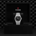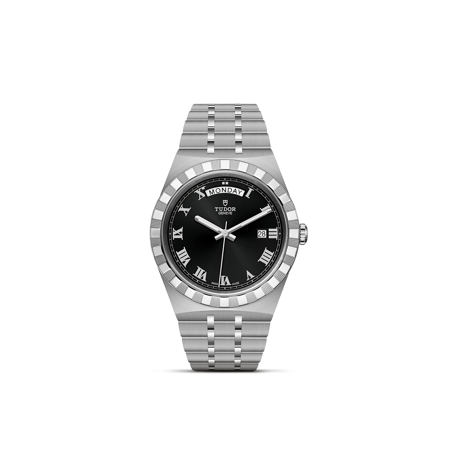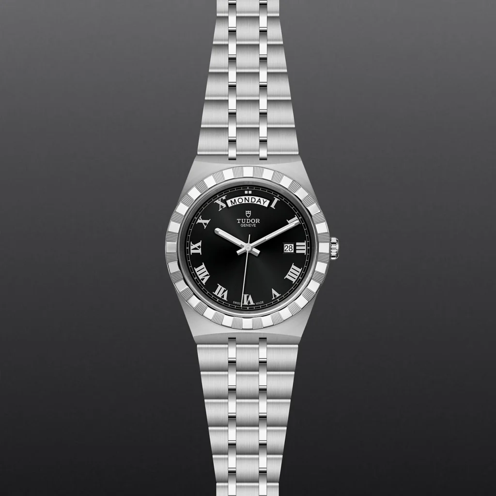 TUDOR Royal M28600-0003, Caixa de 41 mm em aço, Mostrador preto, Estojo Caixa de 41 mm em aço com acabamento polido e acetinado, Bezel Luneta com ranhuras em aço 316L, alternando estrias gravadas com acabamento polido, Movimento mecânico de corda automática, Calibre T603, Mostrador Preto, acabamento sunray, Coroa de rosca em aço com o logótipo TUDOR, Cristal Vidro de safira, Estanque até 100 m, Bracelete incorporada em aço 316L, 5 filas, elos centrais e externos acetinados e escovados, elos intercalados polidos, com fecho desdobrável e fecho de segurança, Tamanho Grande, Material Aço, Mostrador escuro.