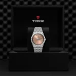 TUDOR Royal M28600-0009, Caixa de 41 mm em aço, Mostrador rosa salmão, Estojo Caixa de 41 mm em aço com acabamento polido e acetinado, Bezel Luneta com ranhuras em aço 316L, alternando estrias gravadas com acabamento polido, Movimento mecânico de corda automática, Calibre T603, Mostrador Rosa salmão, Coroa de rosca em aço com o logótipo TUDOR, Cristal Vidro de safira, Estanque até 100 m, Bracelete incorporada em aço 316L, 5 filas, elos centrais e externos acetinados e escovados, elos intercalados polidos, com fecho desdobrável e fecho de segurança, Tamanho Grande, Material Aço, Mostrador colorido.