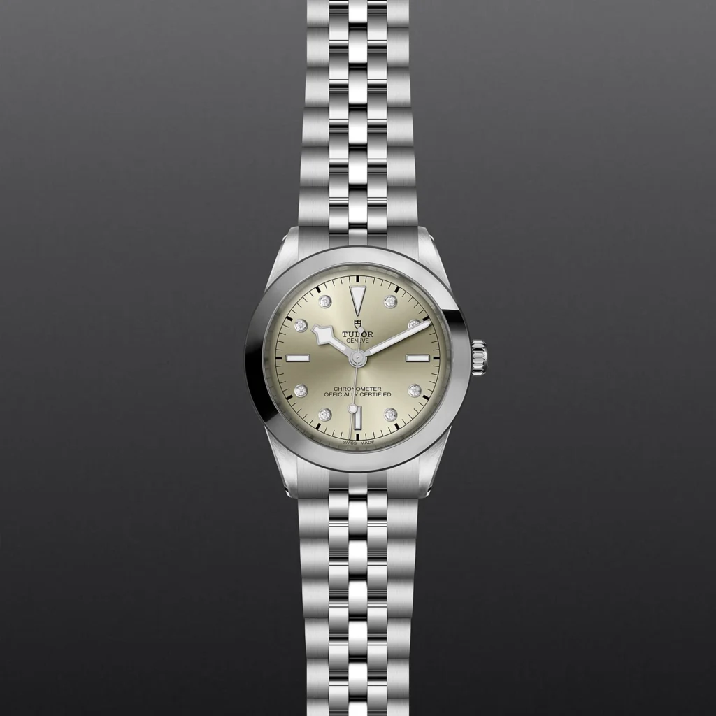 Caixa de 39 mm em aço, Bracelete em aço, Estojo Caixa de 39 mm em aço inoxidável com acabamento polido e acetinado, Bezel Luneta em aço inoxidável com acabamento polido e acetinado, Calibre de Manufatura MT5602 (COSC) Movimento mecânico de corda automática com sistema de rotor bidirecional, Mostrador Cor champagne claro com 8 diamantes, Coroa de rosca com a rosa TUDOR em relevo, Cristal Vidro de safira plano, Estanque até 100 m, Bracelete em aço inoxidável, acabamento polido e acetinado, com fecho desdobrável TUDOR “T-fit” e fecho de segurança, Tamanho Médio, Material Aço, Mostrador colorido.