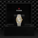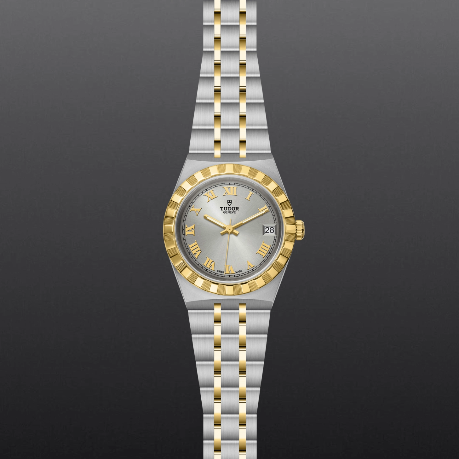 TUDOR Royal M28403-0001, Luneta giratória unidirecional, Bracelete em titânio ou aço, Caixa de tamanho variável com acabamento acetinado, Bezel com disco em cerâmica e material luminescente, Calibre de Manufatura com certificação COSC ou METAS, Movimento mecânico de corda automática, mostrador com acabamento sunray ou mate, Cristal de safira, estanque até no mínimo 200 metros, Bracelete com fecho TUDOR T-fit, extensões e opções adicionais incluídas na caixa.