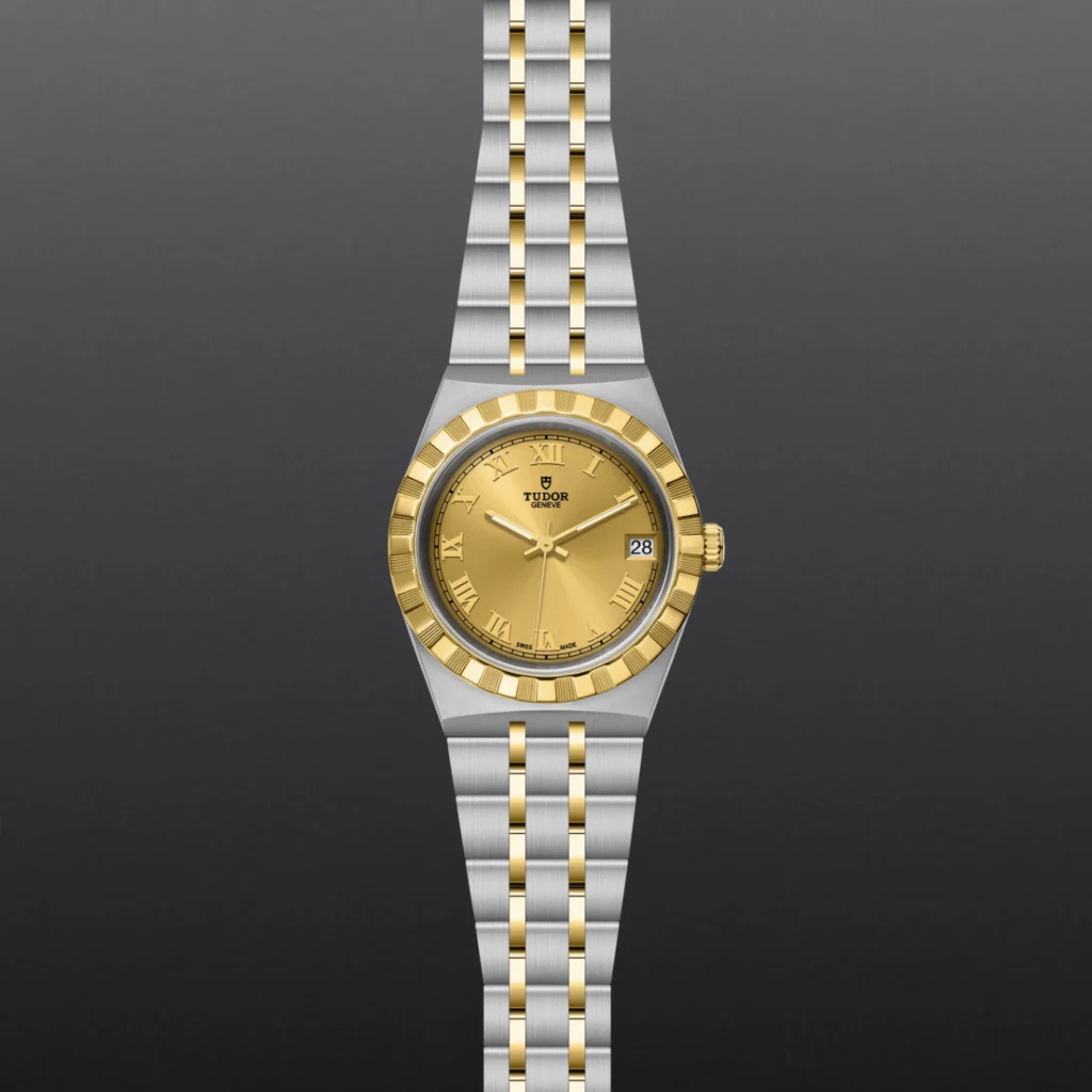 TUDOR Royal M28403-0004, Luneta giratória unidirecional, Bracelete em titânio ou aço, Caixa de tamanho variável com acabamento acetinado, Bezel com disco em cerâmica e material luminescente, Calibre de Manufatura com certificação COSC ou METAS, Movimento mecânico de corda automática, mostrador com acabamento sunray ou mate, Cristal de safira, estanque até no mínimo 200 metros, Bracelete com fecho TUDOR T-fit, extensões e opções adicionais incluídas na caixa.