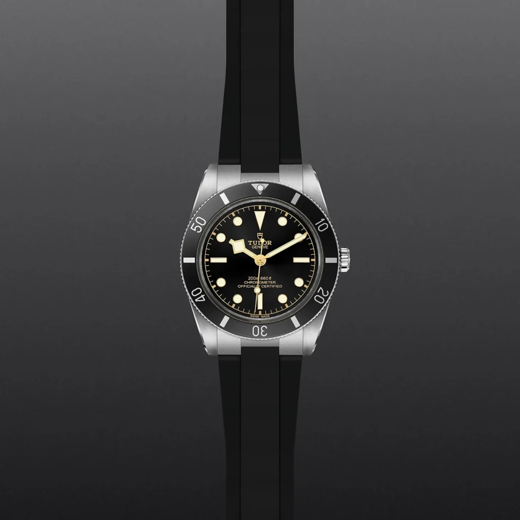 Black Bay 54 M79000N-0002, Caixa de 37 mm em aço, Bracelete em borracha preta, Estojo Caixa de 37 mm em aço inoxidável com acabamento polido e acetinado, Bezel Luneta unidirecional graduada de 60 minutos em aço inoxidável com disco em alumínio sem graduação dos minutos , Calibre de Manufatura MT5400 (COSC) Movimento mecânico de corda automática com sistema de rotor bidirecional, Mostrador Preto, côncavo, Coroa de rosca em aço inoxidável com a rosa TUDOR em relevo, Cristal Vidro de safira côncavo, Estanque até 200 m, Bracelete em borracha com fecho TUDOR “T-fit”, Tamanho Médio, Material Aço, Mostrador escuro.