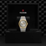 TUDOR Royal M28603-0002, Luneta giratória unidirecional, Bracelete em titânio ou aço, Caixa de tamanho variável com acabamento acetinado, Bezel com disco em cerâmica e material luminescente, Calibre de Manufatura com certificação COSC ou METAS, Movimento mecânico de corda automática, mostrador com acabamento sunray ou mate, Cristal de safira, estanque até no mínimo 200 metros, Bracelete com fecho TUDOR T-fit, extensões e opções adicionais incluídas na caixa.