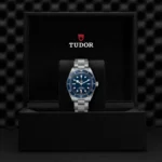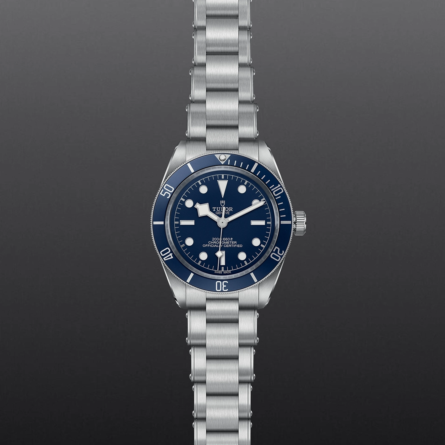 Caixa de 39 mm em aço, Bracelete em aço, Estojo Caixa de 39 mm em aço com acabamento polido e acetinado, Bezel Luneta giratória unidirecional em aço com disco graduado de 60 minutos em alumínio anodizado azul mate, marcas e algarismos prateados, Calibre de Manufatura MT5402 (COSC) Movimento mecânico de corda automática com sistema de rotor bidirecional, Mostrador Azul, côncavo, Coroa de rosca em aço com a rosa TUDOR em relevo, tubo da coroa em aço escovado com acabamento circular, escovado e acetinado, Cristal Vidro de safira côncavo, Estanque até 200 m, Bracelete em aço com rebites com acabamento polido e acetinado, fecho desdobrável e fecho de segurança, Tamanho Médio, Material Aço, Mostrador colorido.