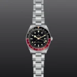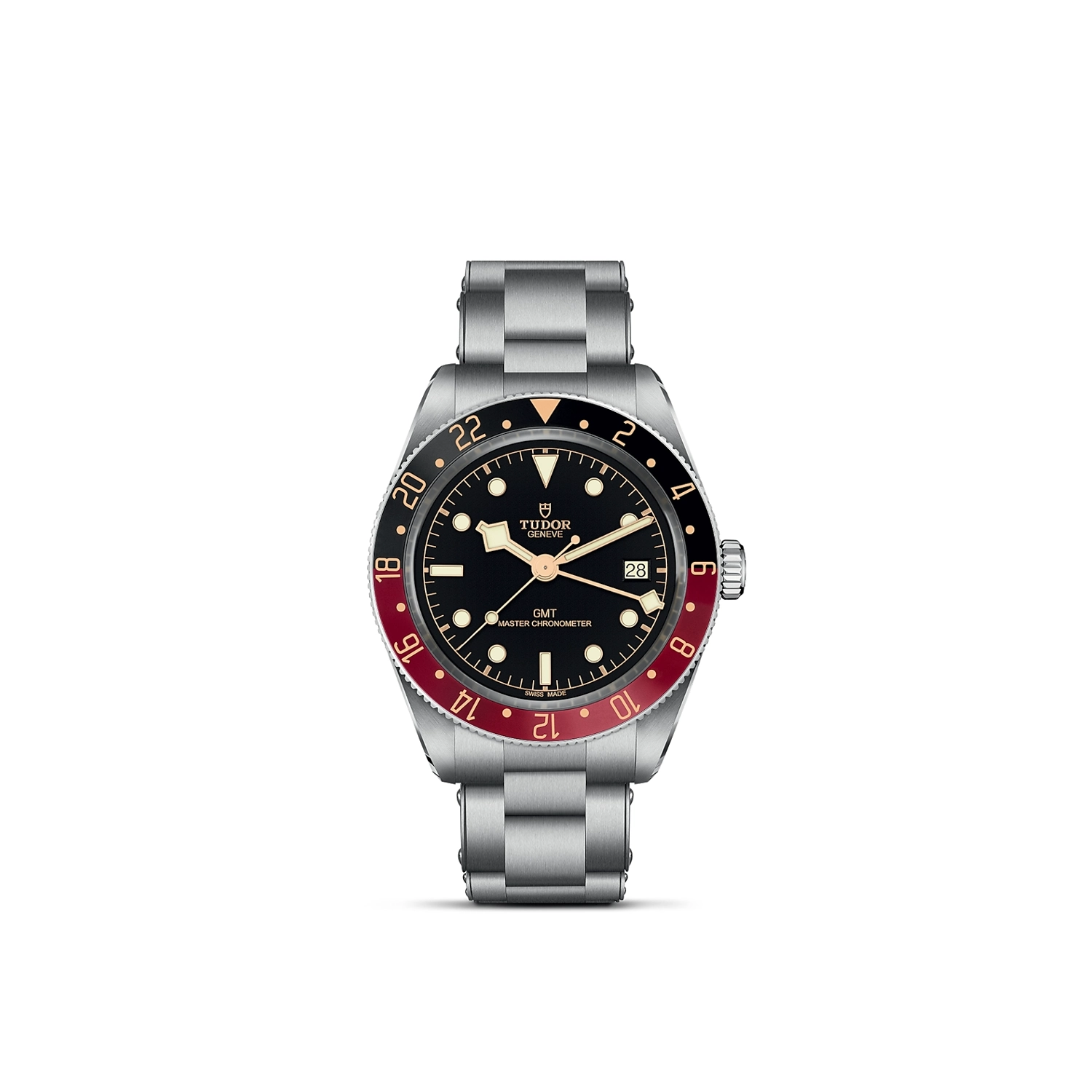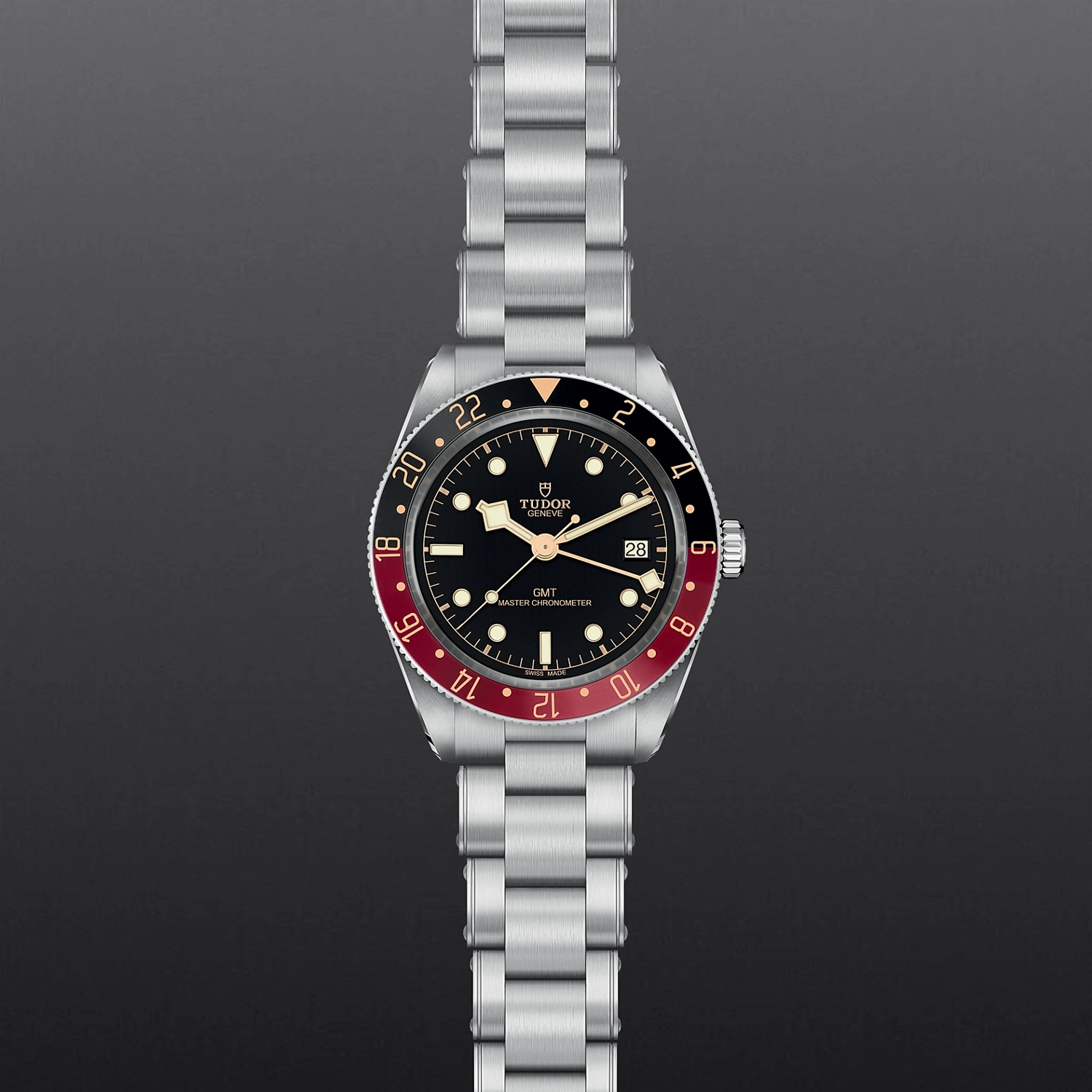 Black Bay 58 GMT M7939G1A0NRU-0001, Caixa de 39 mm em aço, Luneta preta e bordeaux, Estojo Caixa de 39 mm em aço inoxidável com acabamento polido e acetinado, Bezel Luneta giratória bidirecional de 24 horas em aço inoxidável com disco em alumínio anodizado bordeaux e preto, Calibre de Manufatura MT5450-U (certificação COSC e METAS) Movimento mecânico de corda automática com sistema de rotor bidirecional Função GMT integrada, Mostrador Preto, côncavo, marcadores de horas com apliques dourados, Coroa de rosca em aço inoxidável com a rosa TUDOR em relevo, Cristal Vidro de safira côncavo, Estanque até 200 m, Bracelete em aço inoxidável com 3 elos com rebites, acabamento polido e acetinado, fecho TUDOR “T-fit”, Tamanho Médio, Material Aço, Mostrador escuro.