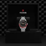 Caixa de 39 mm em aço, Luneta preta e bordeaux, Estojo Caixa de 39 mm em aço inoxidável com acabamento polido e acetinado, Bezel Luneta giratória bidirecional de 24 horas em aço inoxidável com disco em alumínio anodizado bordeaux e preto, Calibre de Manufatura MT5450-U (certificação COSC e METAS) Movimento mecânico de corda automática com sistema de rotor bidirecional Função GMT integrada, Mostrador Preto, côncavo, marcadores de horas com apliques dourados, Coroa de rosca em aço inoxidável com a rosa TUDOR em relevo, Cristal Vidro de safira côncavo, Estanque até 200 m, Bracelete em aço inoxidável com 3 elos com rebites, acabamento polido e acetinado, fecho TUDOR “T-fit”, Tamanho Médio, Material Aço, Mostrador escuro.