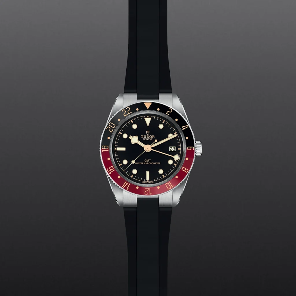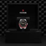 Caixa de 39 mm em aço, Bracelete em borracha, Estojo Caixa de 39 mm em aço inoxidável com acabamento polido e acetinado, Bezel Luneta giratória bidirecional de 24 horas em aço inoxidável com disco em alumínio anodizado bordeaux e preto, Calibre de Manufatura MT5450-U (certificação COSC e METAS) Movimento mecânico de corda automática com sistema de rotor bidirecional Função GMT integrada, Mostrador Preto, côncavo, marcadores de horas com apliques dourados, Coroa de rosca em aço inoxidável com a rosa TUDOR em relevo, Cristal Vidro de safira côncavo, Estanque até 200 m, Bracelete em borracha com fecho TUDOR “T-fit”, Tamanho Médio, Material Aço, Mostrador escuro.