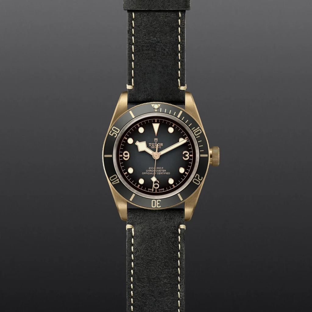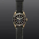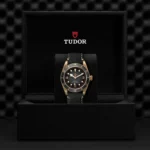 Caixa de 43 mm em bronze, Bracelete em pele preta, Estojo Caixa de 43 mm em bronze com fundo de caixa em aço com tratamento PVD de cor bronze, acabamento acetinado, Bezel Luneta giratória unidirecional em bronze com disco graduado de 60 minutos em alumínio anodizado cinzento-ardósia mate, Calibre de Manufatura MT5601 (COSC) Movimento mecânico de corda automática com sistema de rotor bidirecional, Mostrador Cinzento-ardósia, côncavo, Coroa de rosca em bronze adornada com a rosa TUDOR gravada, Cristal Vidro de safira côncavo, Estanque até 200 m, Bracelete arredondada em pele nobuck preta com fivela em bronze, Tamanho Grande, Material Bronze, Mostrador claro.
