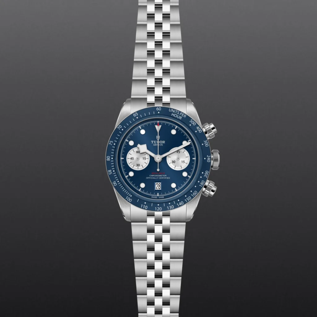 Black Bay Chrono M79360B-0002, Luneta giratória unidirecional, Bracelete em titânio ou aço, Caixa de tamanho variável com acabamento acetinado, Bezel com disco em cerâmica e material luminescente, Calibre de Manufatura com certificação COSC ou METAS, Movimento mecânico de corda automática, mostrador com acabamento sunray ou mate, Cristal de safira, estanque até no mínimo 200 metros, Bracelete com fecho TUDOR T-fit, extensões e opções adicionais incluídas na caixa.