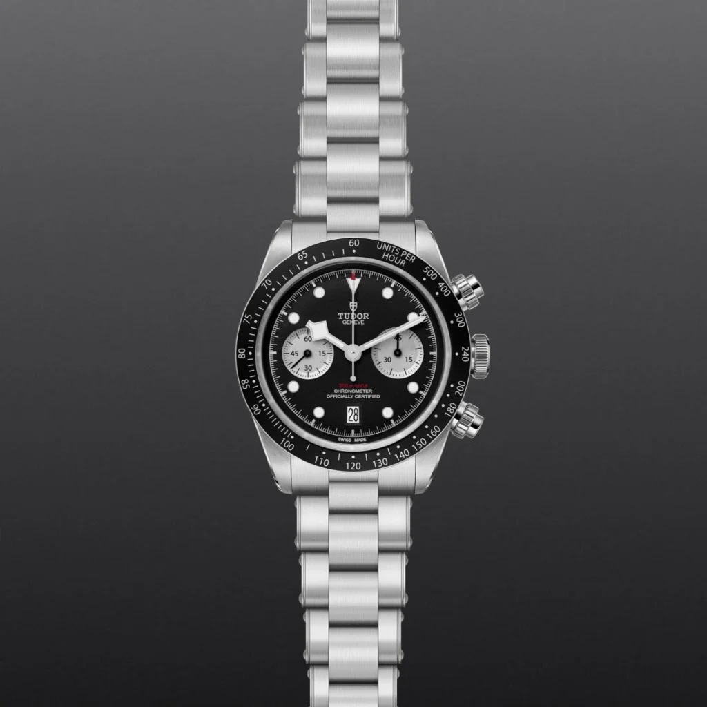 Black Bay Chrono M79360N-0011, Luneta giratória unidirecional, Bracelete em titânio ou aço, Caixa de tamanho variável com acabamento acetinado, Bezel com disco em cerâmica e material luminescente, Calibre de Manufatura com certificação COSC ou METAS, Movimento mecânico de corda automática, mostrador com acabamento sunray ou mate, Cristal de safira, estanque até no mínimo 200 metros, Bracelete com fecho TUDOR T-fit, extensões e opções adicionais incluídas na caixa.