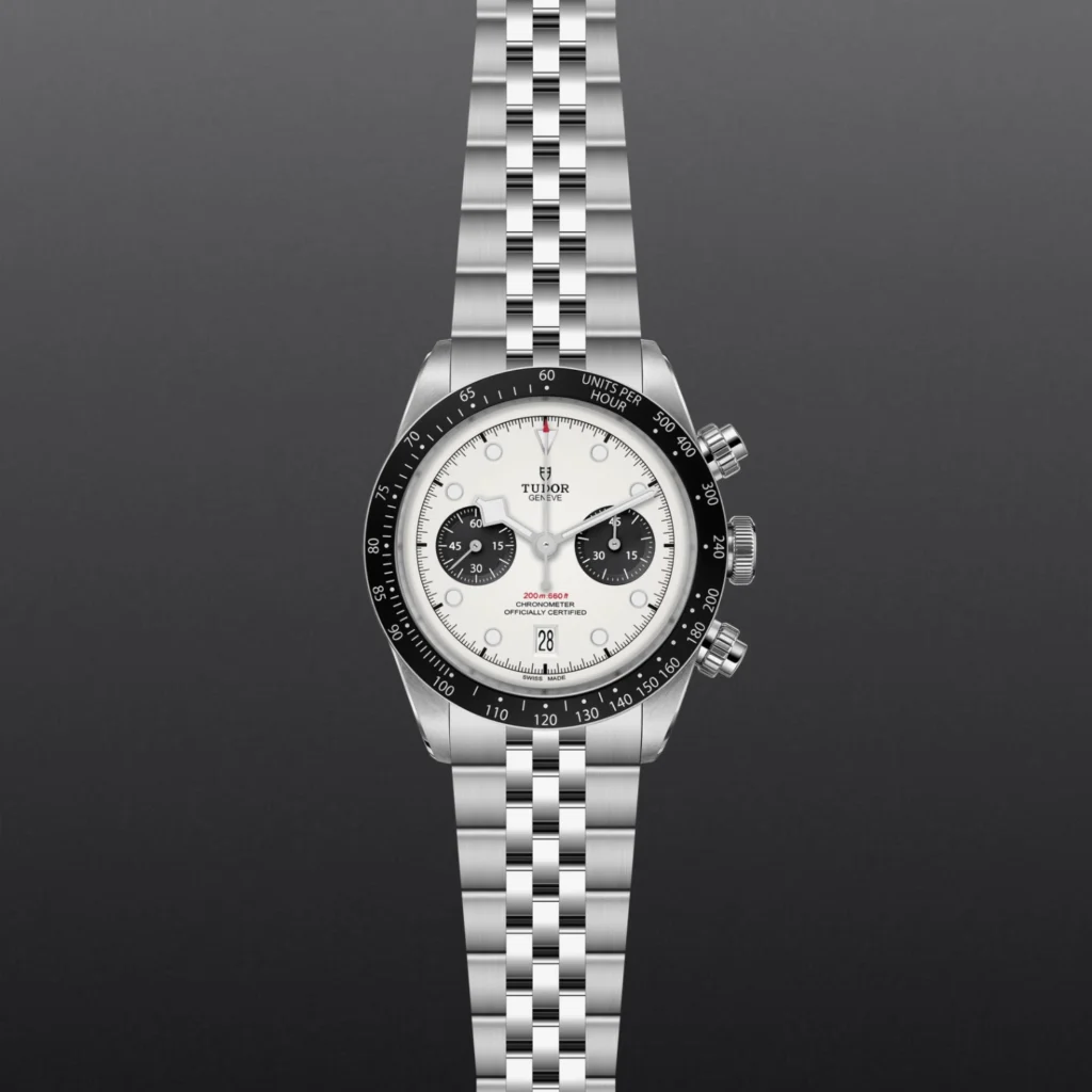 Black Bay Chrono M79360N-0014, Luneta giratória unidirecional, Bracelete em titânio ou aço, Caixa de tamanho variável com acabamento acetinado, Bezel com disco em cerâmica e material luminescente, Calibre de Manufatura com certificação COSC ou METAS, Movimento mecânico de corda automática, mostrador com acabamento sunray ou mate, Cristal de safira, estanque até no mínimo 200 metros, Bracelete com fecho TUDOR T-fit, extensões e opções adicionais incluídas na caixa.