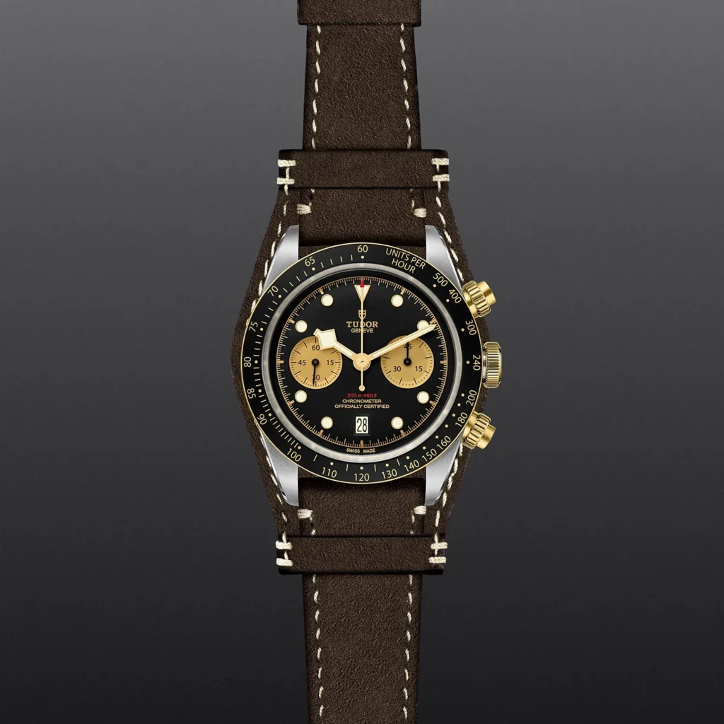 Caixa de 41 mm em aço, Bracelete em pele castanha, Estojo Caixa de 41 mm em aço com acabamento polido e acetinado, Bezel Luneta fixa em ouro amarelo maciço com disco de alumínio anodizado preto mate com escala taquimétrica, marcas em ouro amarelo, Calibre de Manufatura MT5813 com função de cronógrafo Movimento de cronógrafo mecânico de corda automática com sistema de rotor bidirecional, Mostrador Preto, côncavo, Coroa de rosca com a rosa TUDOR em relevo. Botões de rosca em ouro amarelo maciço posicionados às 2 e 4 horas. Aço revestido por uma camada de ouro amarelo de 0,3 mm, Cristal Vidro de safira côncavo, Estanque até 200 m, Bracelete em pele castanha com bund amovível, fecho desdobrável e fecho de segurança, Tamanho Grande, Material Aço e ouro, Mostrador escuro.