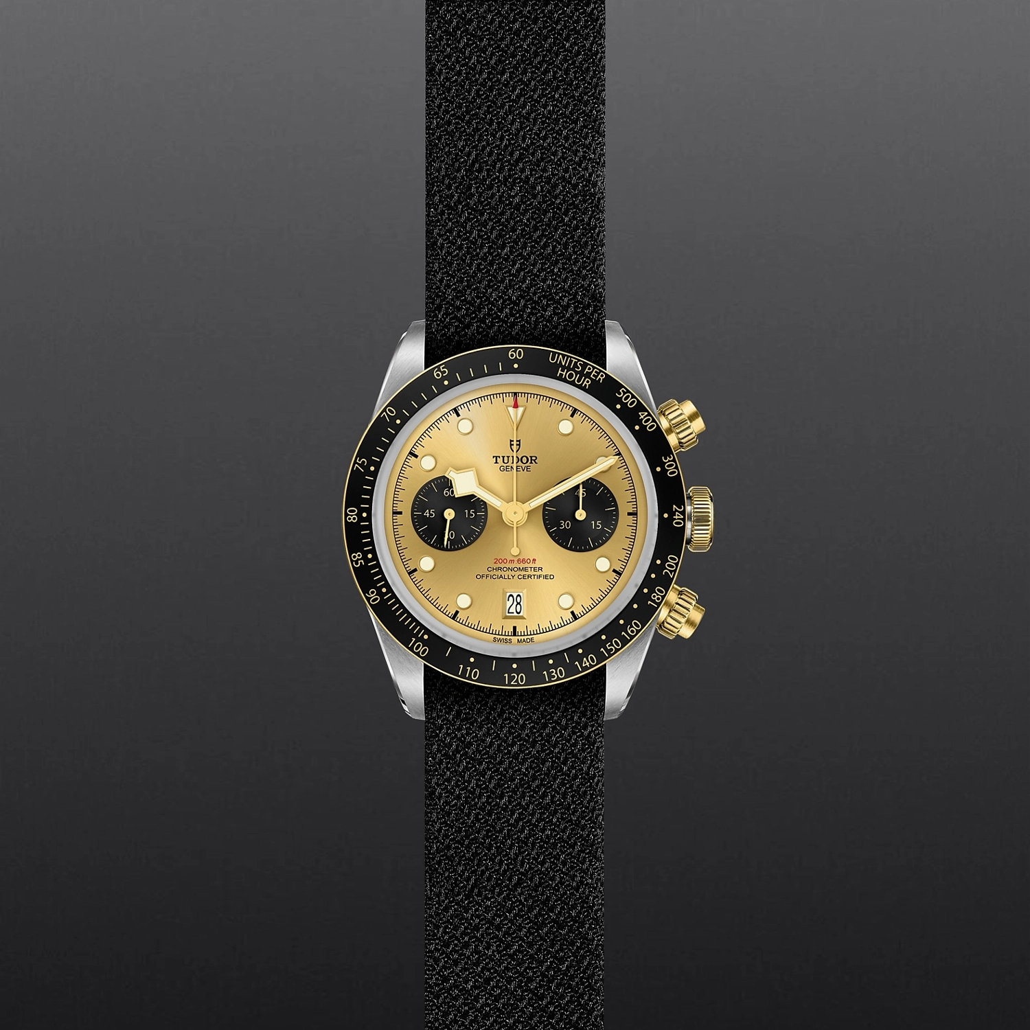 Caixa de 41 mm em aço, Bracelete em tecido preto, Estojo Caixa de 41 mm em aço com acabamento polido e acetinado, Bezel Luneta fixa em ouro amarelo maciço com disco de alumínio anodizado preto mate com escala taquimétrica, marcas em ouro amarelo, Calibre de Manufatura MT5813 com função de cronógrafo Movimento de cronógrafo mecânico de corda automática com sistema de rotor bidirecional, Mostrador Cor champagne com contadores pretos, côncavo, Coroa de rosca com a rosa TUDOR em relevo. Botões de rosca em ouro amarelo maciço posicionados às 2 e 4 horas. Aço revestido por uma camada de ouro amarelo de 0,3 mm, Cristal Vidro de safira côncavo, Estanque até 200 m, Bracelete em tecido preto com fivela, Tamanho Grande, Material Aço e ouro, Mostrador colorido.