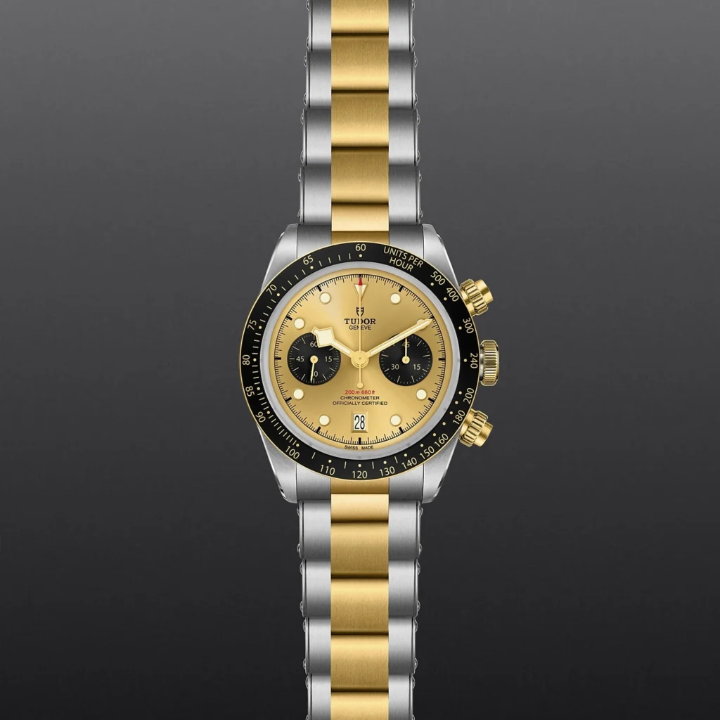 Black Bay Chrono S&G M79363N-0007, Caixa de 41 mm em aço, Bracelete em aço e ouro amarelo, Estojo Caixa de 41 mm em aço com acabamento polido e acetinado, Bezel Luneta fixa em ouro amarelo maciço com disco de alumínio anodizado preto mate com escala taquimétrica, marcas em ouro amarelo, Calibre de Manufatura MT5813 com função de cronógrafo Movimento de cronógrafo mecânico de corda automática com sistema de rotor bidirecional, Mostrador Cor champagne com contadores pretos, côncavo, Coroa de rosca com a rosa TUDOR em relevo. Botões de rosca em ouro amarelo maciço posicionados às 2 e 4 horas. Aço revestido por uma camada de ouro amarelo de 0,3 mm, Cristal Vidro de safira côncavo, Estanque até 200 m, Primeiros elos centrais, às 6 e 12 horas, em ouro amarelo maciço. Restantes elos centrais em aço ou aço revestido por uma camada de ouro amarelo de 0,2 mm. Fecho desdobrável e fecho de segurança, Tamanho Grande, Material Aço e ouro, Mostrador colorido.