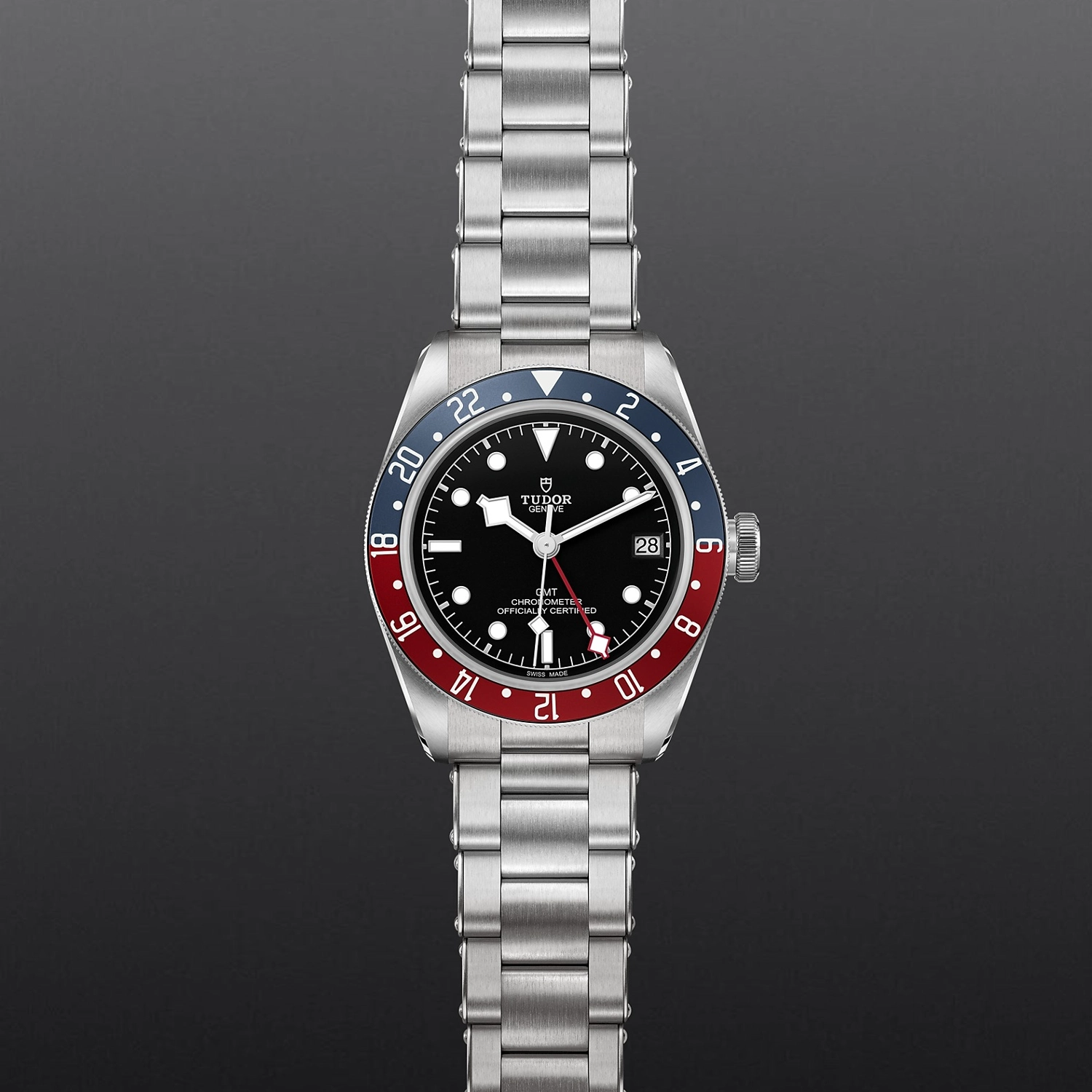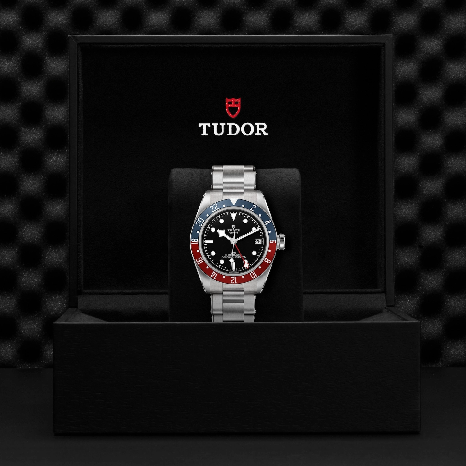 Black Bay GMT M79830RB-0001, Caixa de 41 mm em aço, Bracelete em aço com rebites, Estojo Caixa de 41 mm em aço com acabamento polido e acetinado, Bezel Luneta giratória bidirecional em aço com 48 encaixes, disco de alumínio anodizado graduado de 24 horas em bordeaux e azul mate, Calibre de Manufatura MT5652 (COSC) Movimento mecânico de corda automática com sistema de rotor bidirecional Arquitetura integrada, Mostrador Preto, côncavo, Coroa de rosca em aço com a rosa TUDOR em relevo, tubo da coroa em aço escovado com acabamento circular, escovado e acetinado, Cristal Vidro de safira côncavo, Estanque até 200 m, Bracelete em aço com rebites com acabamento polido e acetinado, fecho desdobrável e fecho de segurança, Tamanho Grande, Material Aço, Mostrador escuro.
