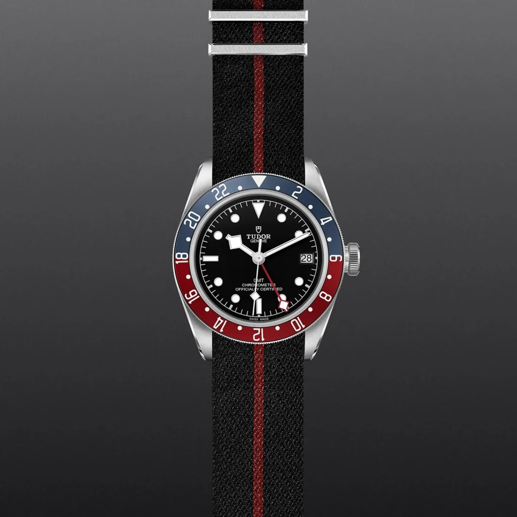Black Bay GMT M79830RB-0003, Caixa de 41 mm em aço, Bracelete em tecido, Estojo Caixa de 41 mm em aço com acabamento polido e acetinado, Bezel Luneta giratória bidirecional em aço com 48 encaixes, disco de alumínio anodizado graduado de 24 horas em bordeaux e azul mate, Calibre de Manufatura MT5652 (COSC) Movimento mecânico de corda automática com sistema de rotor bidirecional Arquitetura integrada, Mostrador Preto, côncavo, Coroa de rosca em aço com a rosa TUDOR em relevo, tubo da coroa em aço escovado com acabamento circular, escovado e acetinado, Cristal Vidro de safira côncavo, Estanque até 200 m, Bracelete em tecido preto com faixa bordeaux e fivela, Tamanho Grande, Material Aço, Mostrador escuro.