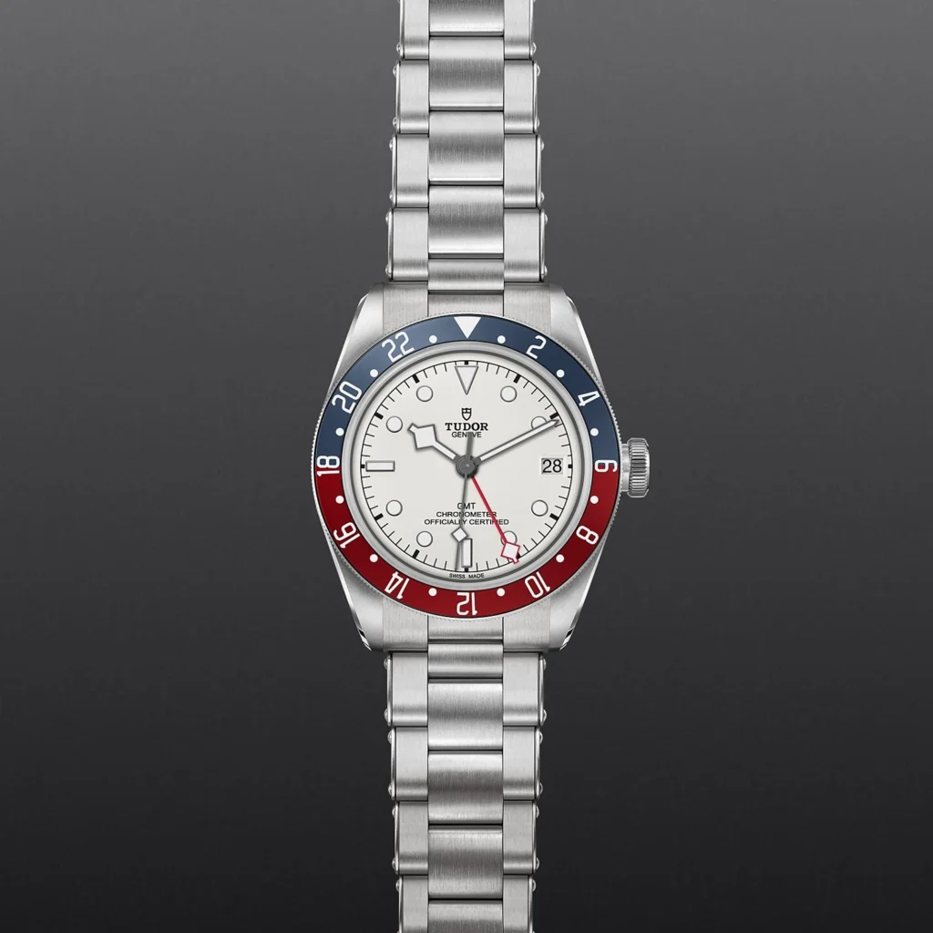Black Bay GMT M79830RB-0010, Caixa de 41 mm em aço, Bracelete em aço com rebites, Estojo Caixa de 41 mm em aço com acabamento polido e acetinado, Bezel Luneta giratória bidirecional em aço com 48 encaixes, disco de alumínio anodizado graduado de 24 horas em bordeaux e azul mate, Calibre de Manufatura MT5652 (COSC) Movimento mecânico de corda automática com sistema de rotor bidirecional Arquitetura integrada, Mostrador Mostrador opalino côncavo com acabamento por galvanoplastia, Coroa de rosca em aço com a rosa TUDOR em relevo, tubo da coroa em aço escovado com acabamento circular, escovado e acetinado, Cristal Vidro de safira côncavo, Estanque até 200 m, Bracelete em aço com rebites com acabamento polido e acetinado, fecho desdobrável e fecho de segurança, Tamanho Grande, Material Aço, Mostrador claro.