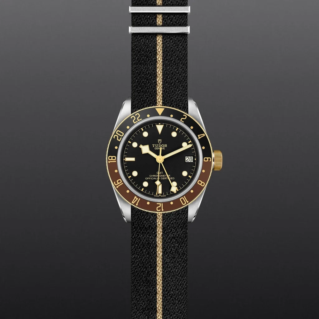 Black Bay GMT S&G M79833MN-0004, Caixa de 41 mm em aço, Bracelete em tecido preto com faixa bege, Estojo Caixa de 41 mm em aço com acabamento polido e acetinado, Bezel Luneta giratória bidirecional com 48 ranhuras feita a partir de um núcleo em aço, revestida por uma camada de ouro amarelo de 0,3 mm. Disco de alumínio anodizado preto e castanho mate, graduado de 24 horas, Calibre de Manufatura MT5652 (COSC) Movimento mecânico de corda automática com sistema de rotor bidirecional Arquitetura integrada, Mostrador Preto, côncavo, Coroa de rosca com a rosa TUDOR gravada e lacada em preto, com tubo da coroa em alumínio anodizado preto. Aço revestido por uma camada de ouro amarelo de 0,3 mm, Cristal Vidro de safira côncavo, Estanque até 200 m, Bracelete em tecido preto com faixa bege e fivela, Tamanho Grande, Material Aço e ouro, Mostrador escuro.